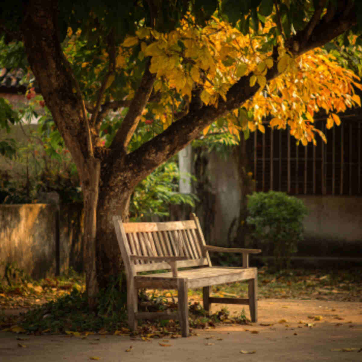 A cozy wooden bench under a tree is a classic spot for reflecting and journaling.