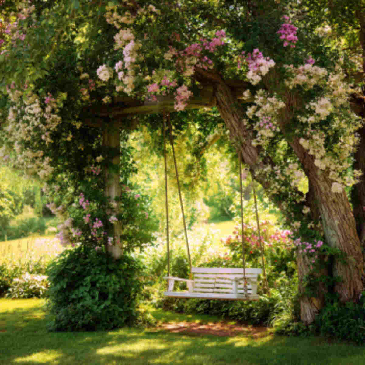 A swing under flowering trees gives gentle movement while journaling, adding playfulness and relaxation.