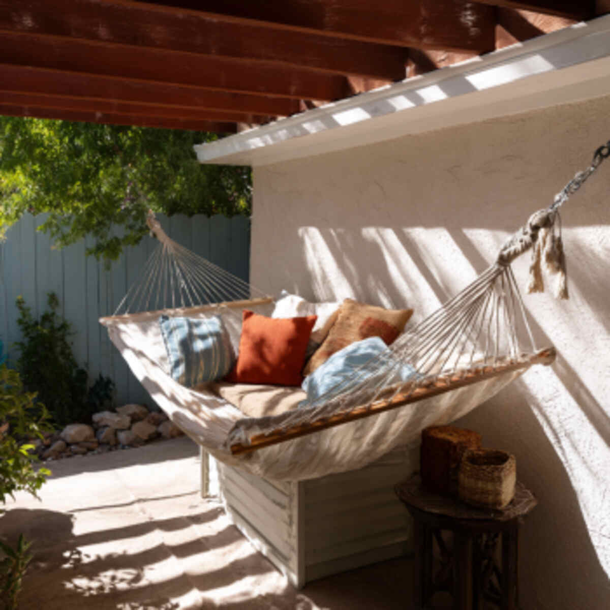 A hammock tucked in a shaded corner lets you sway gently while observing birds or leaves.