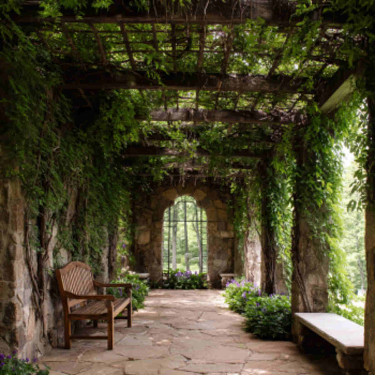 A pergola covered in climbing vines creates a shaded, intimate journaling space.