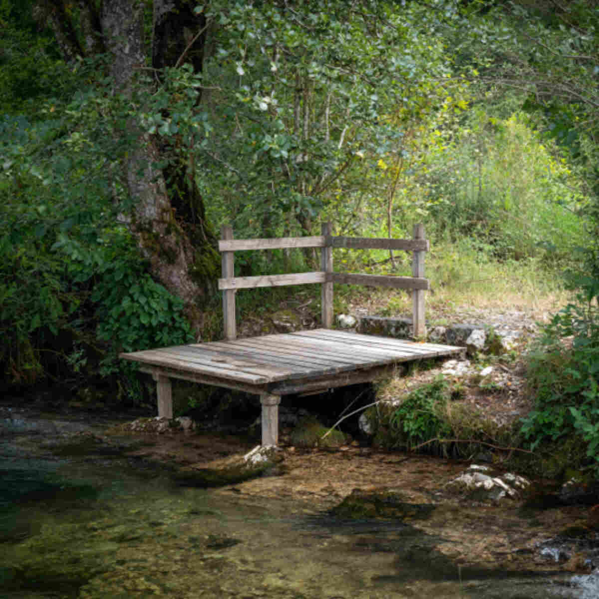 A wooden platform near a small backyard stream creates a serene space for reflection and journaling.