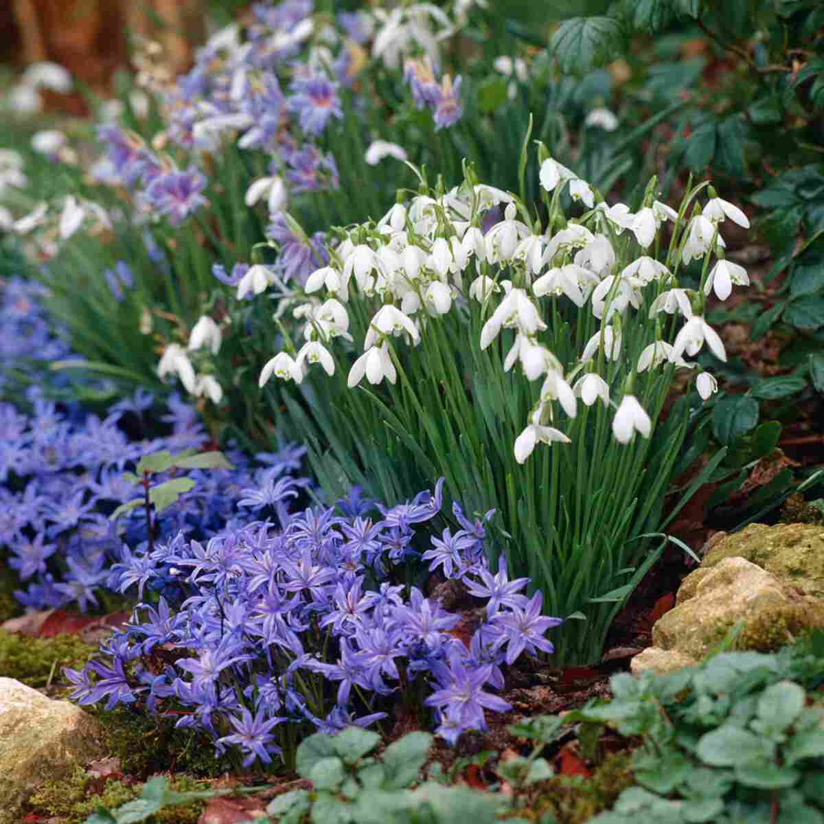 Snowdrops combined with chionodoxa are perfect for early-spring Bulb Layering in Flower Beds Ideas that emphasize delicate beauty.