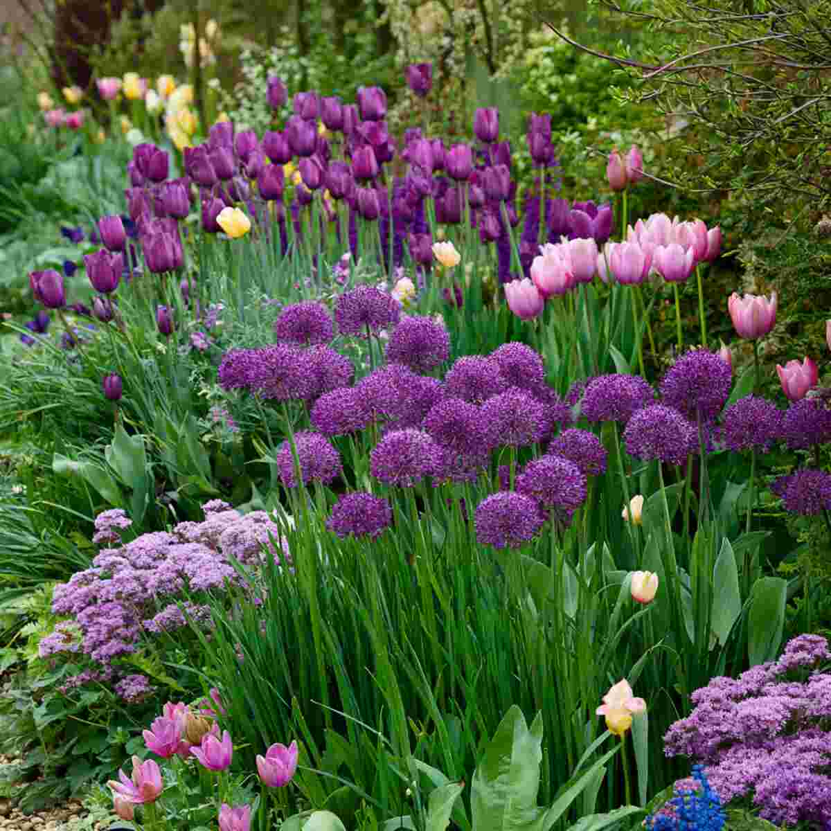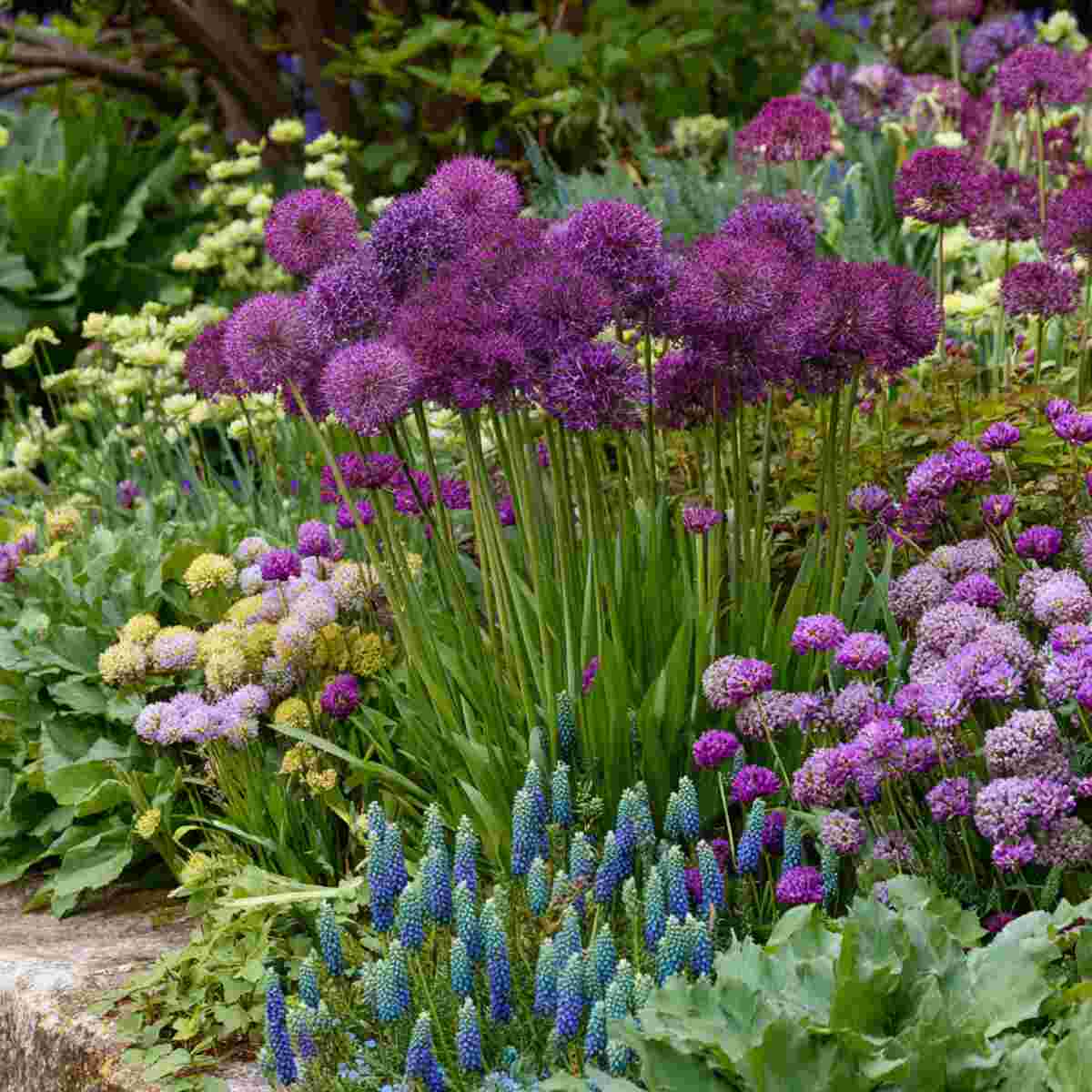 Muscari bloom early and fill the ground layer, while alliums burst through later with spherical flower heads.