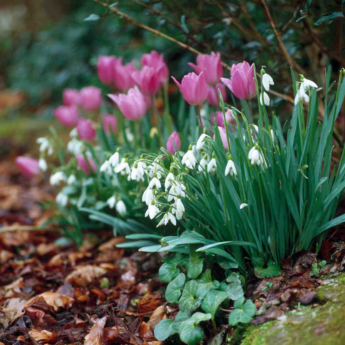 Snowdrops appear very early and create a delicate preview of spring at the surface, while tulips follow with bolder color from deeper layers.
