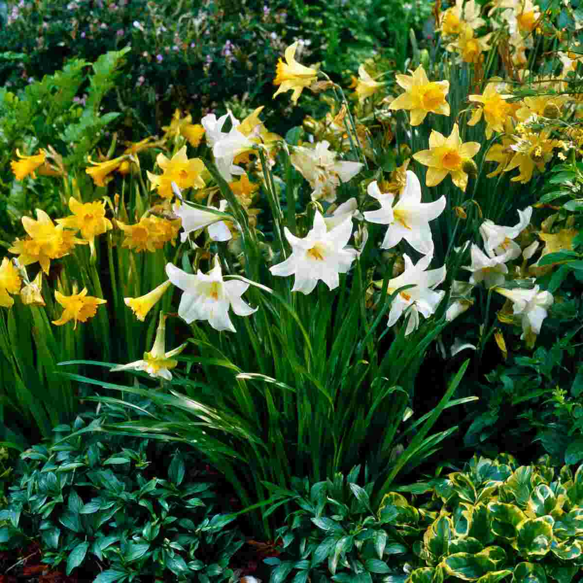 Narcissus burst into bloom earlier in spring, while lilies take over for summer color once the daffodils fade.