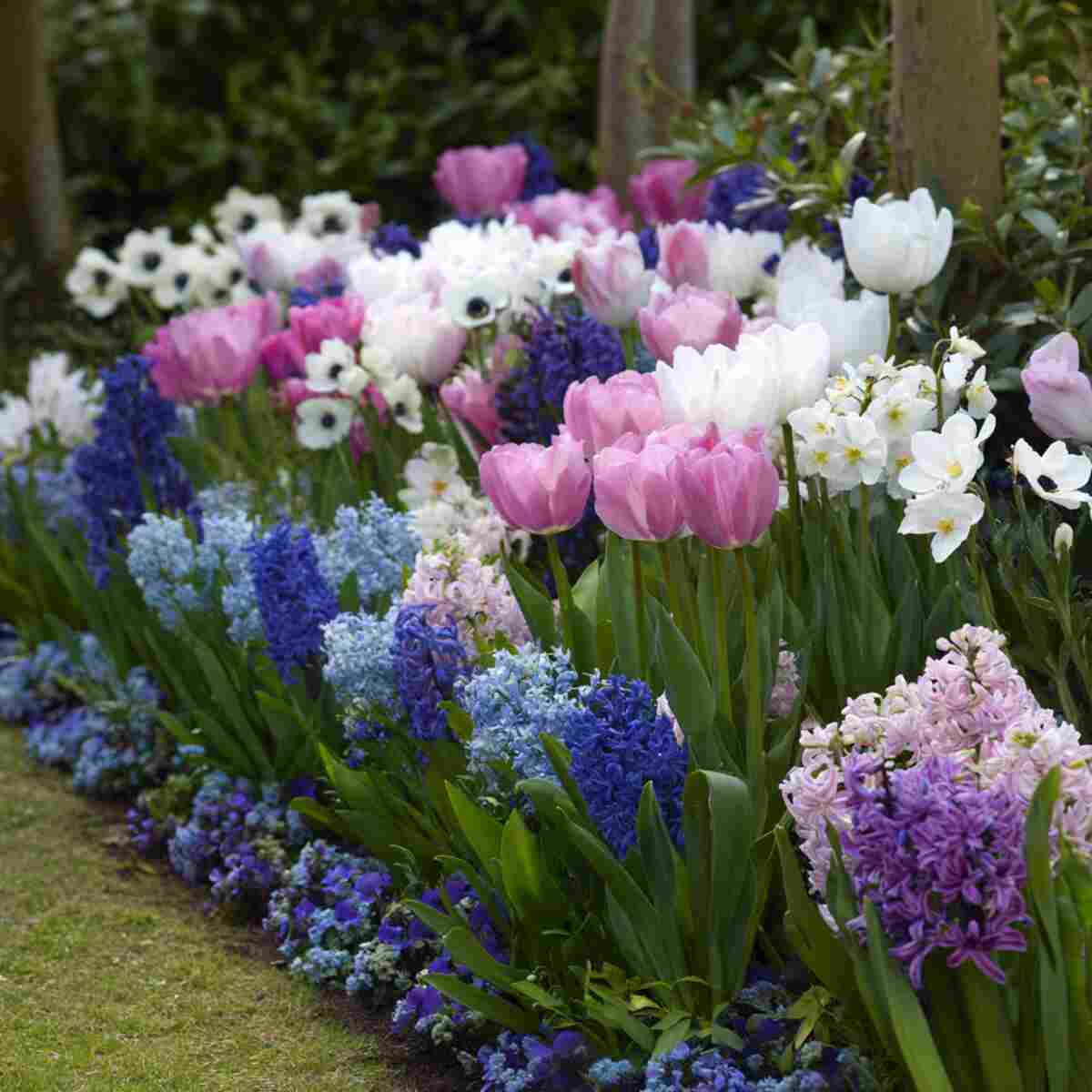 Combining tulips, hyacinths, and anemones is one of the more dynamic Bulb Layering in Flower Beds Ideas, offering different shapes and bloom times.