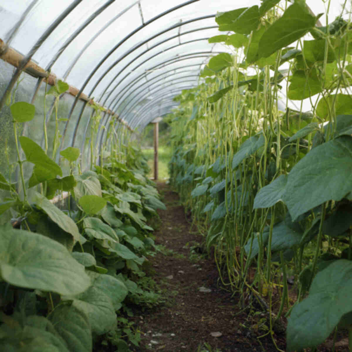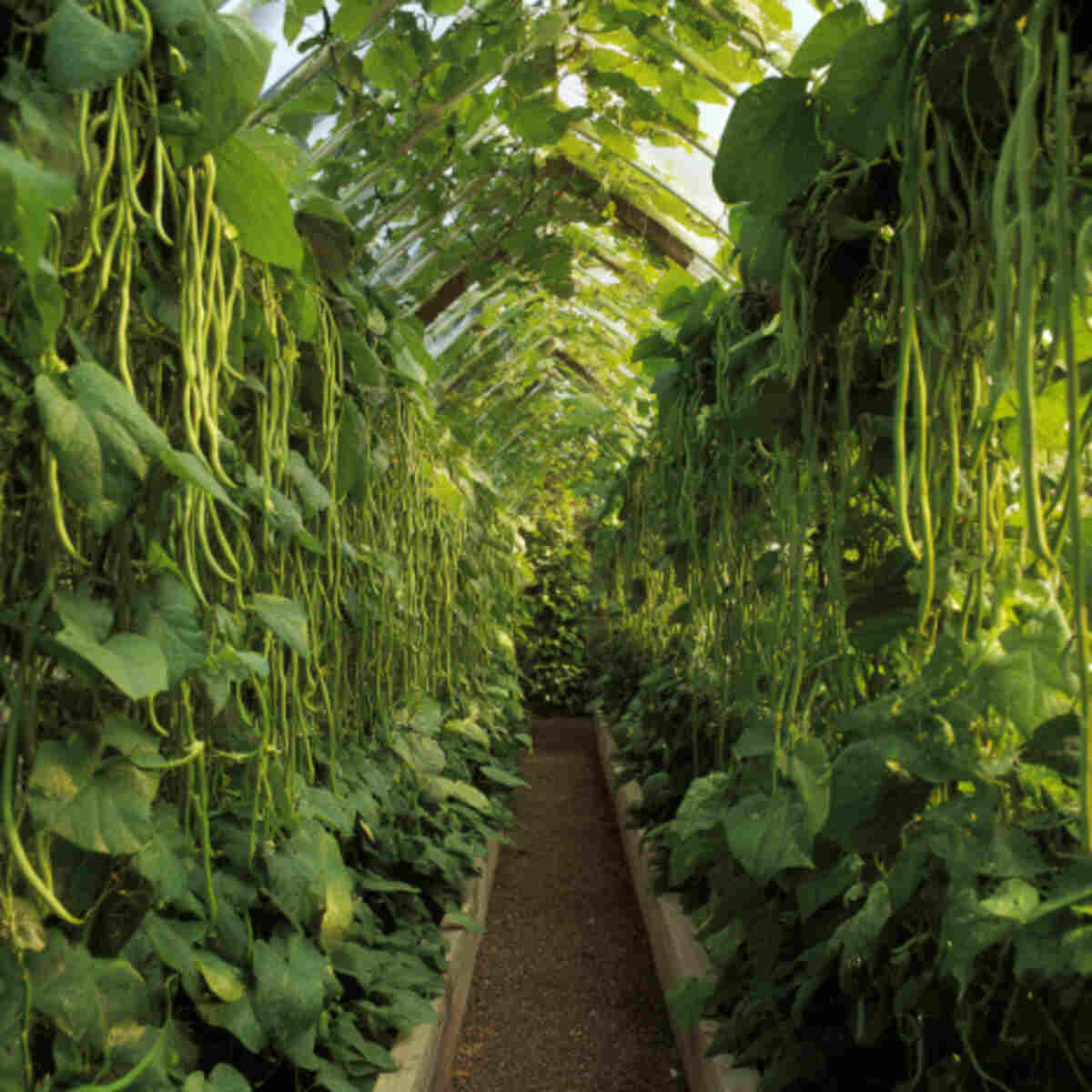A hoop house tunnel made from flexible rods covered with netting or wire allows beans to grow in a rounded shape.