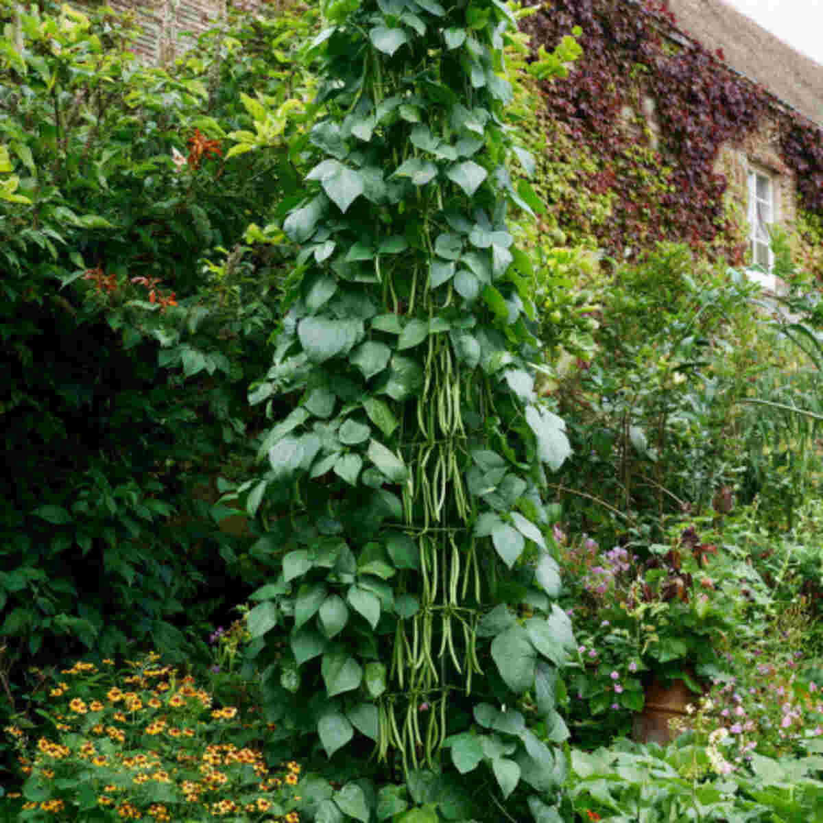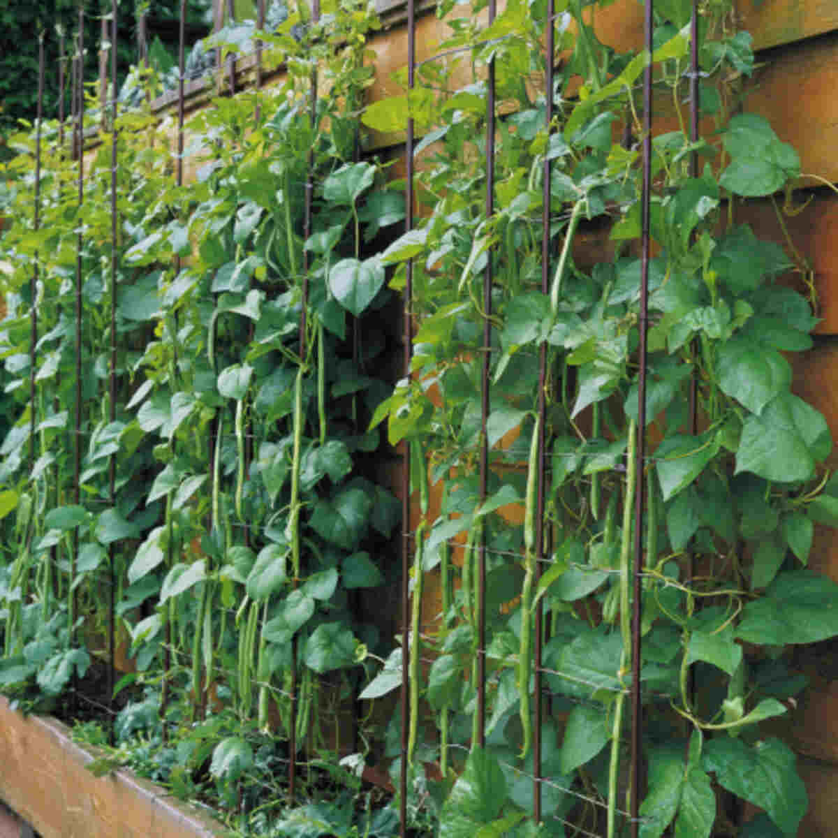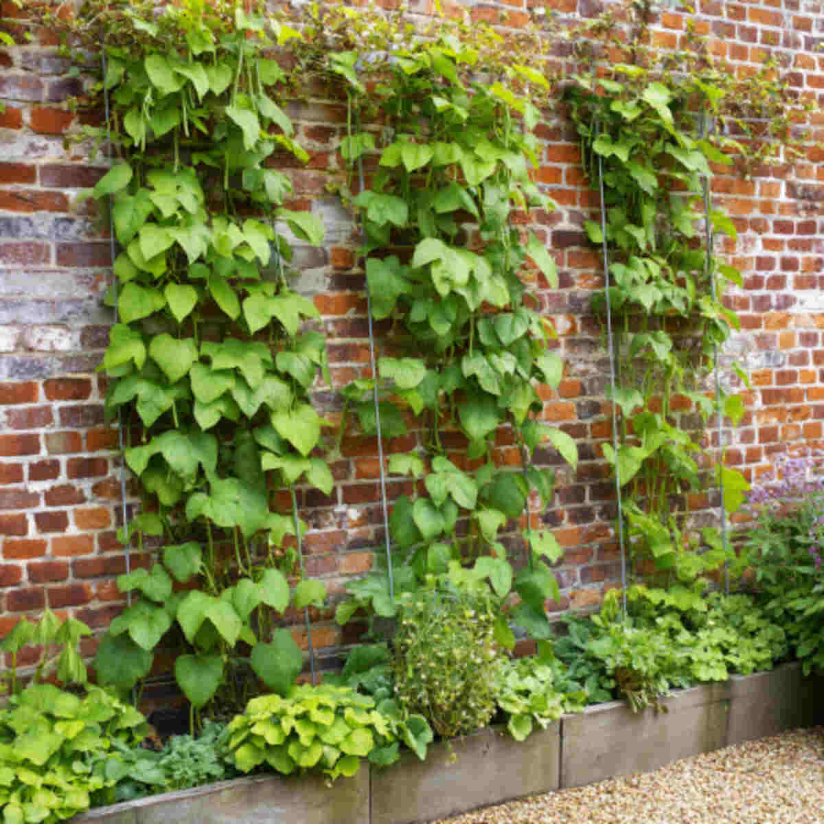 A vertical garden wall fitted with bean supports can turn plain walls into productive green spaces.