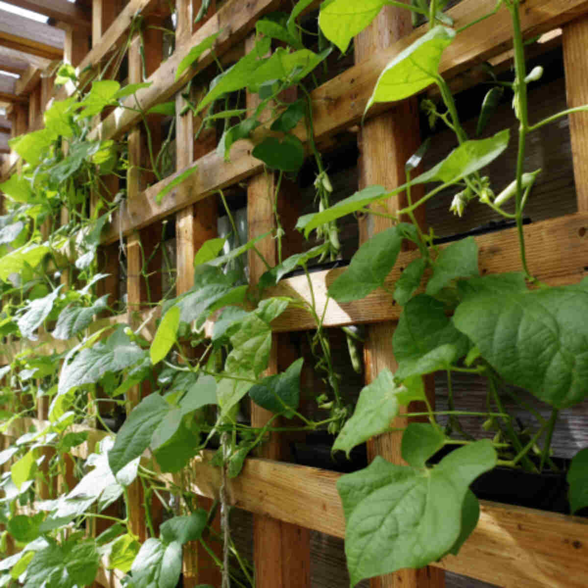 Old wooden pallets can be turned into vertical supports for beans to climb.