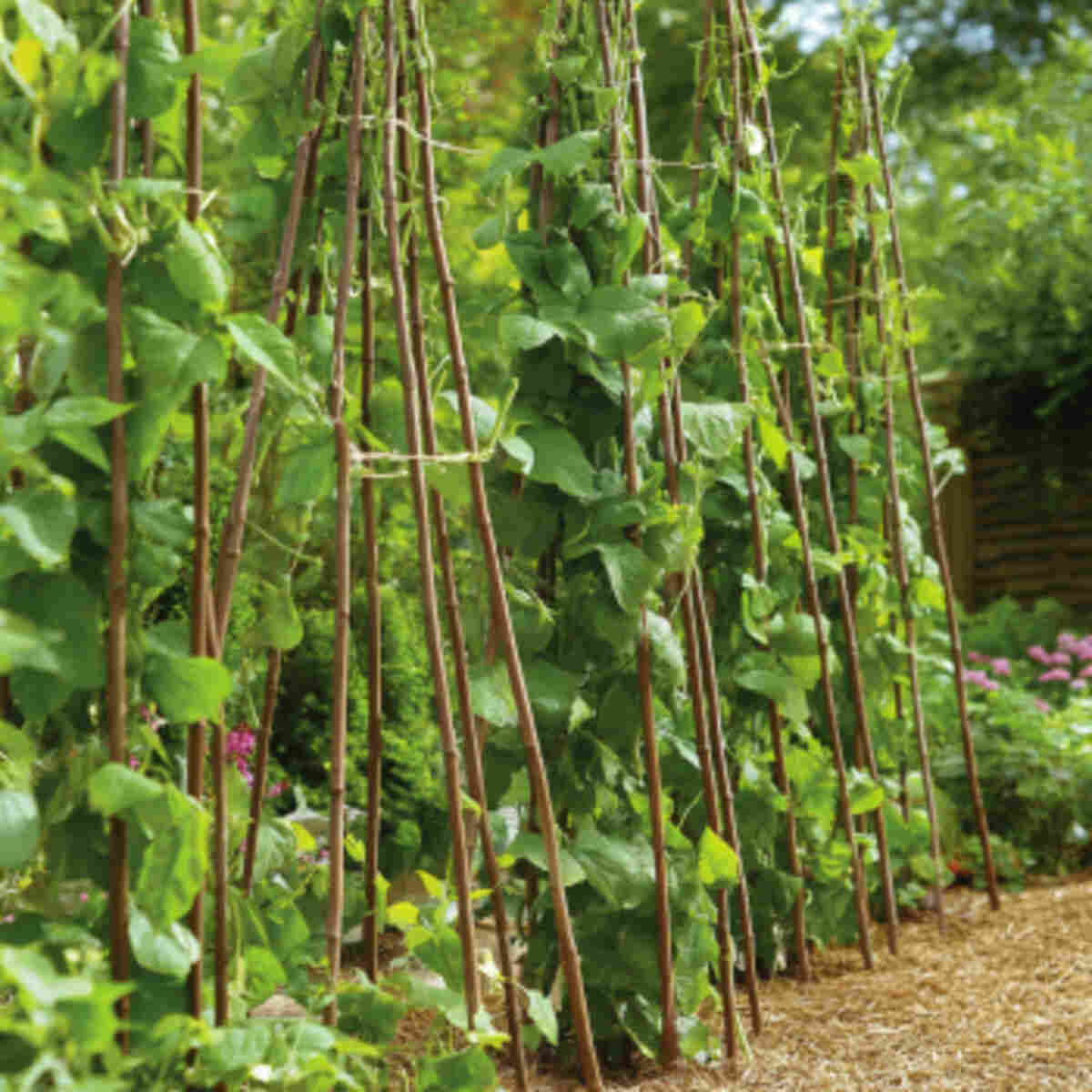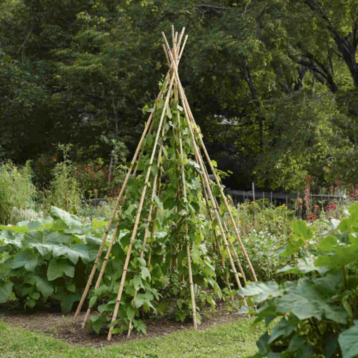By tying bamboo poles together at the top, beans naturally spiral upward, creating a strong structure. This design also saves ground space and makes harvesting beans much easier.
