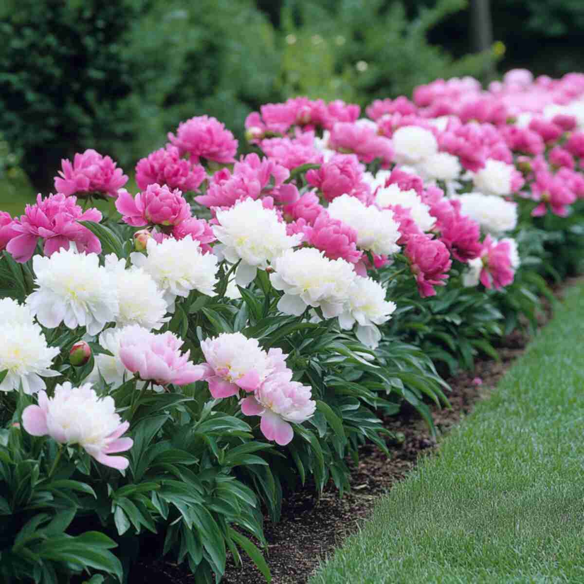 A pink and white peony border creates a soft, romantic feel that instantly elevates your garden’s charm.