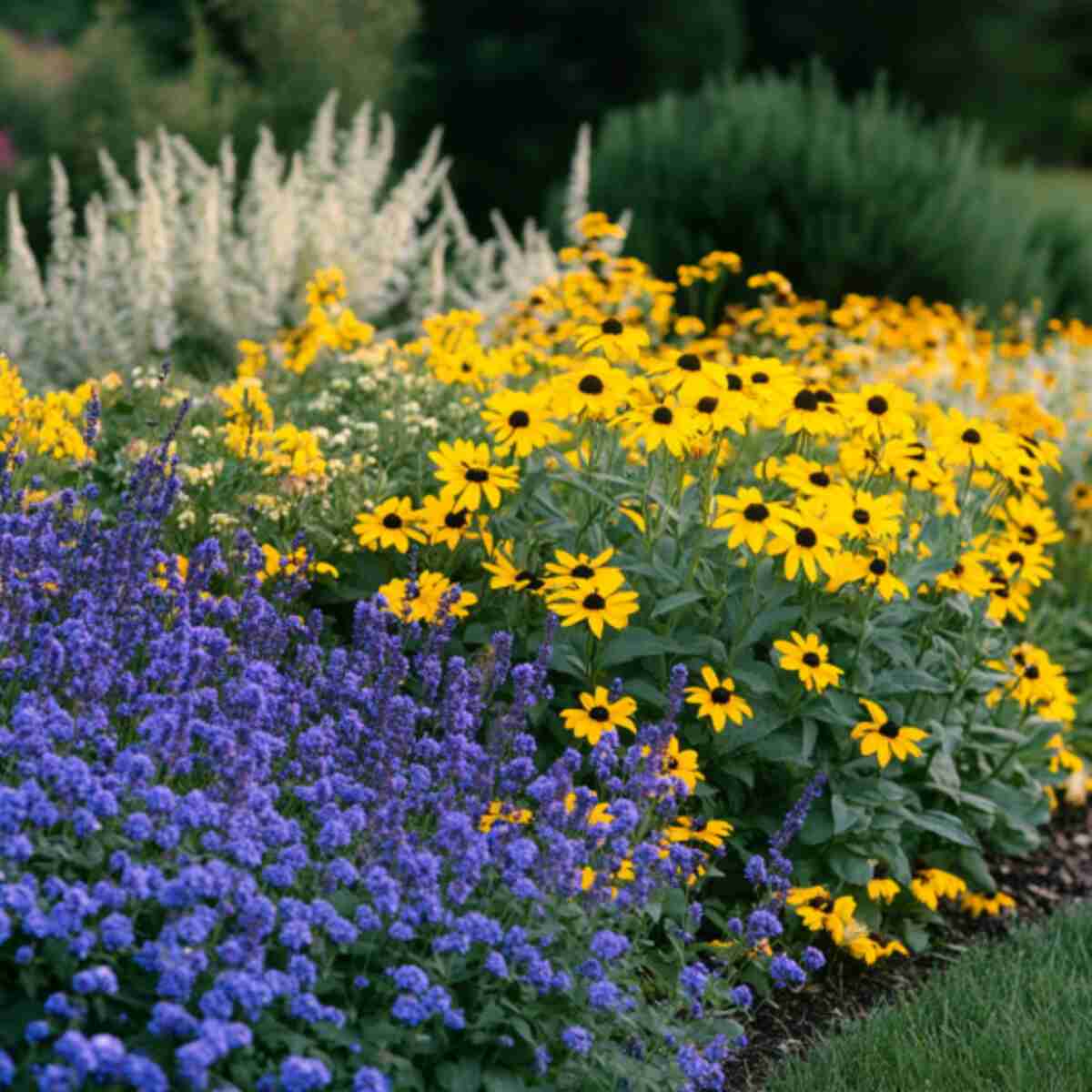 Blue and yellow flowers attract pollinators while creating a vibrant, cheerful garden bed.