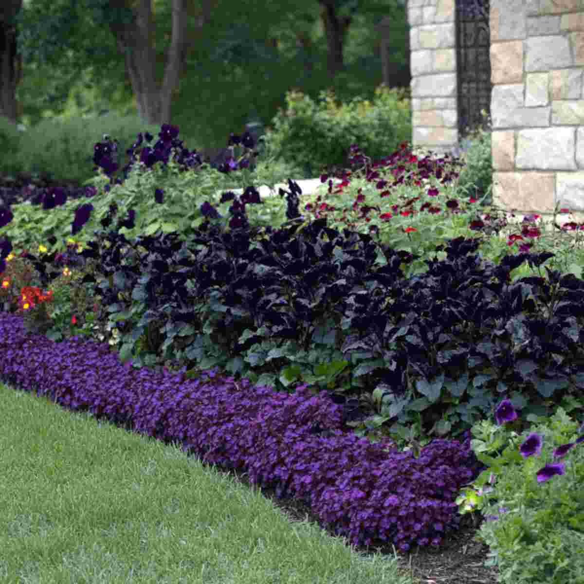 A bed filled with black and deep purple blooms creates a dramatic, gothic-inspired garden design.