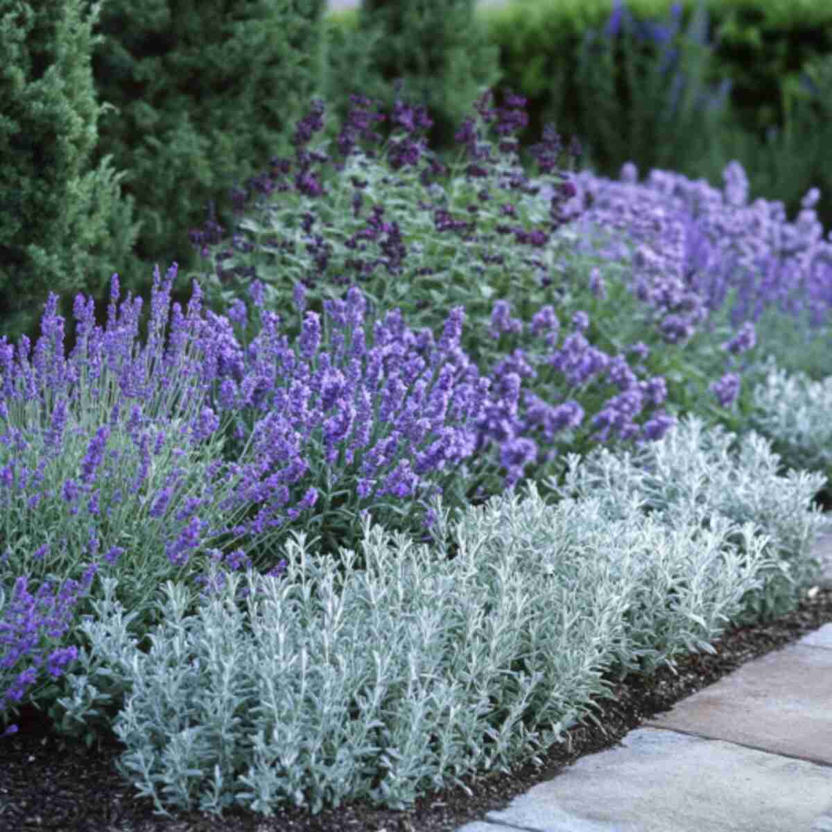 Combining lavender and silver-toned foliage brings a calming and harmonious blend to your garden beds.