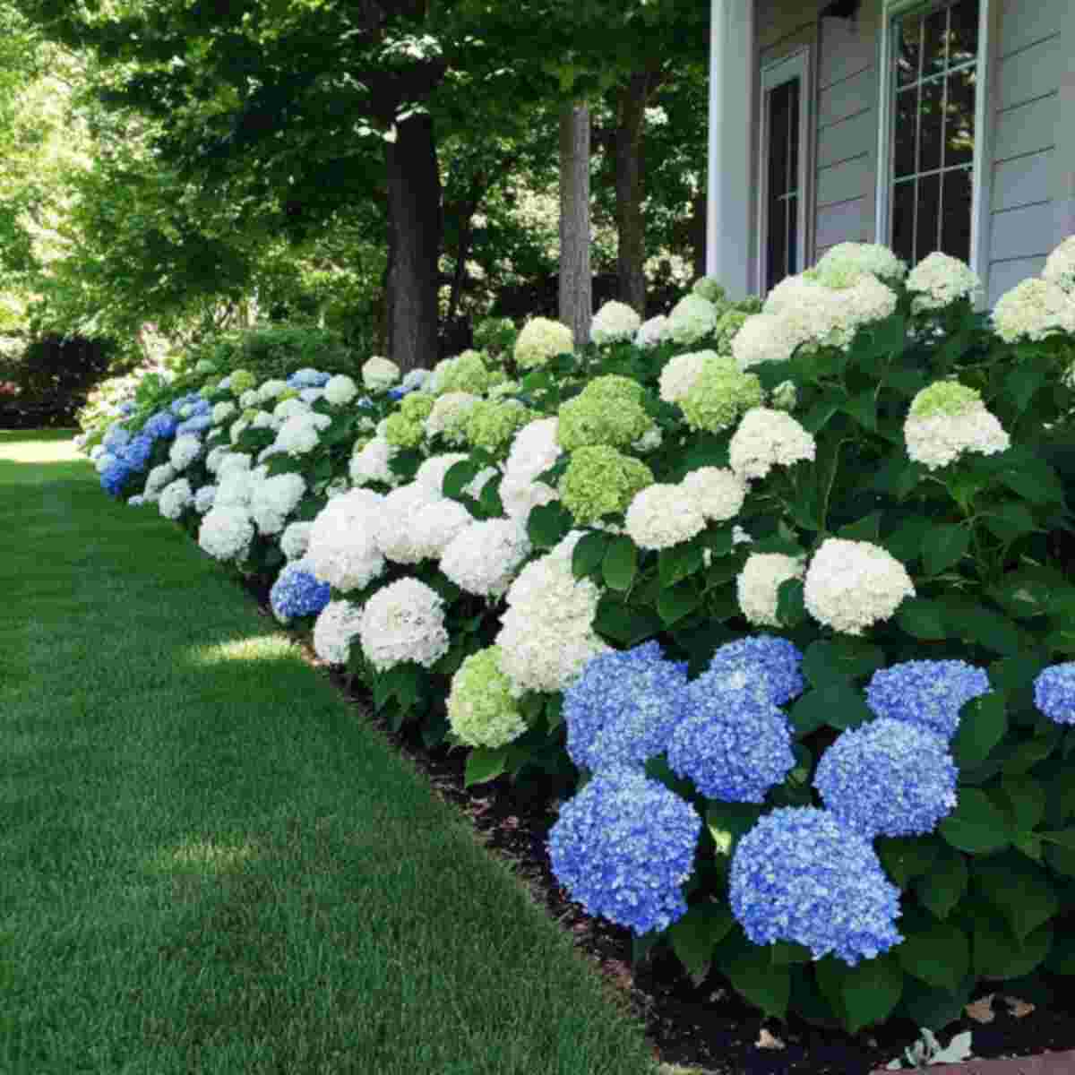 Blue and white hydrangeas create a refreshing and serene corner display that feels clean and balanced. This color pairing highlights the value of Color-Coordinated Flower Beds Garden Ideas by showing how cool tones can create depth and visual calmness.