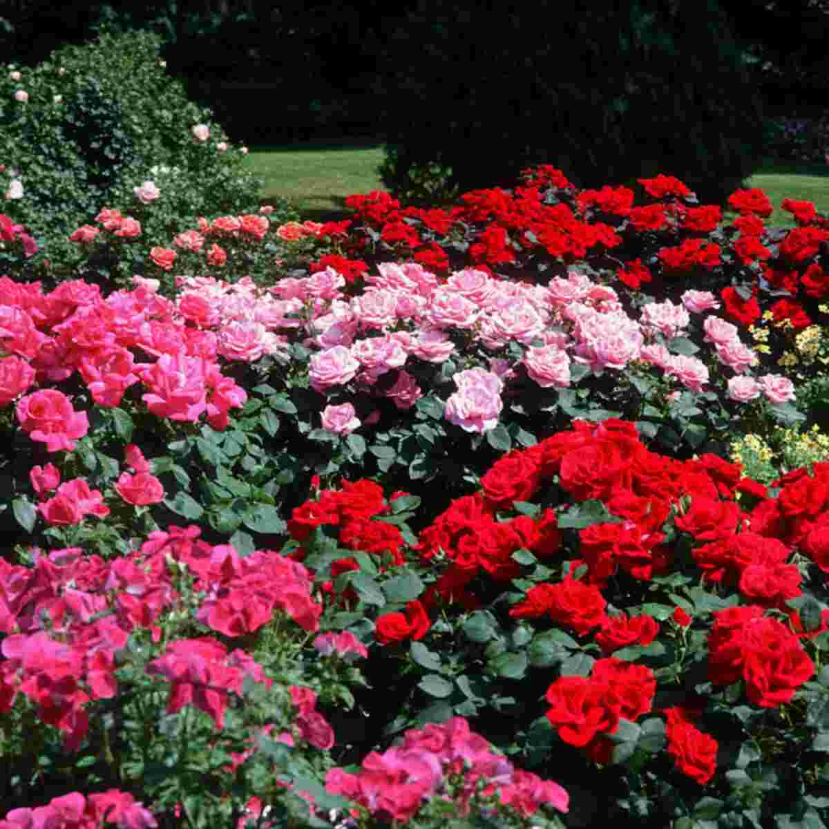 Red and pink roses form a bold yet harmonious garden bed with a romantic character.