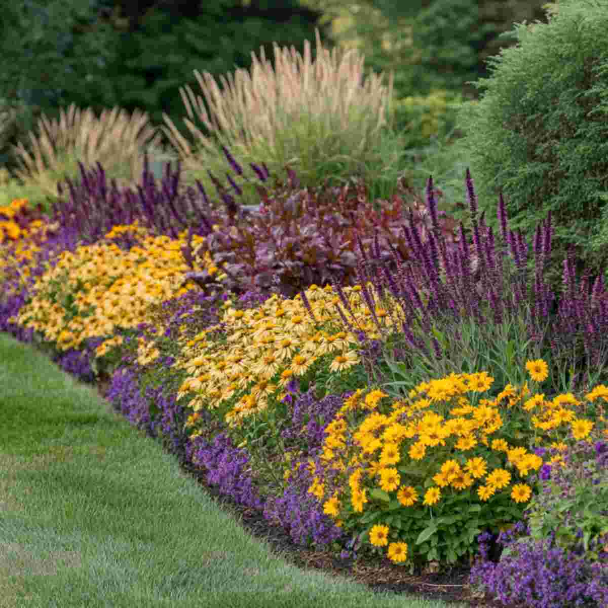 A mix of purple and gold perennials brings contrast and vibrancy to your landscape.