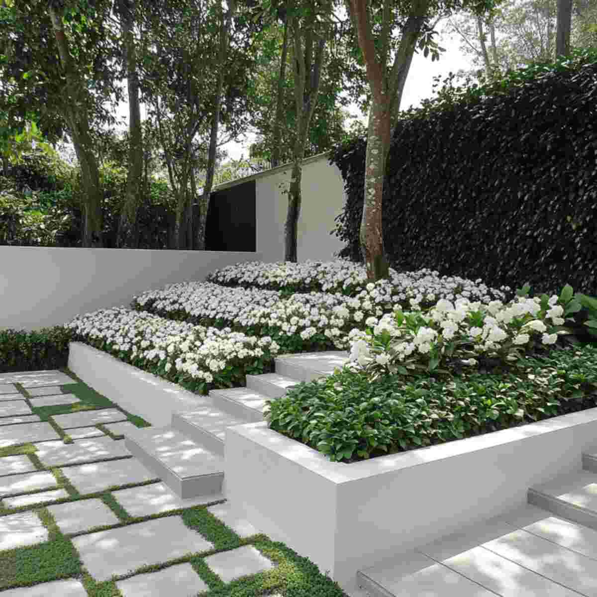 A white and green garden bed embodies simplicity and freshness, ideal for modern or minimalist landscapes.