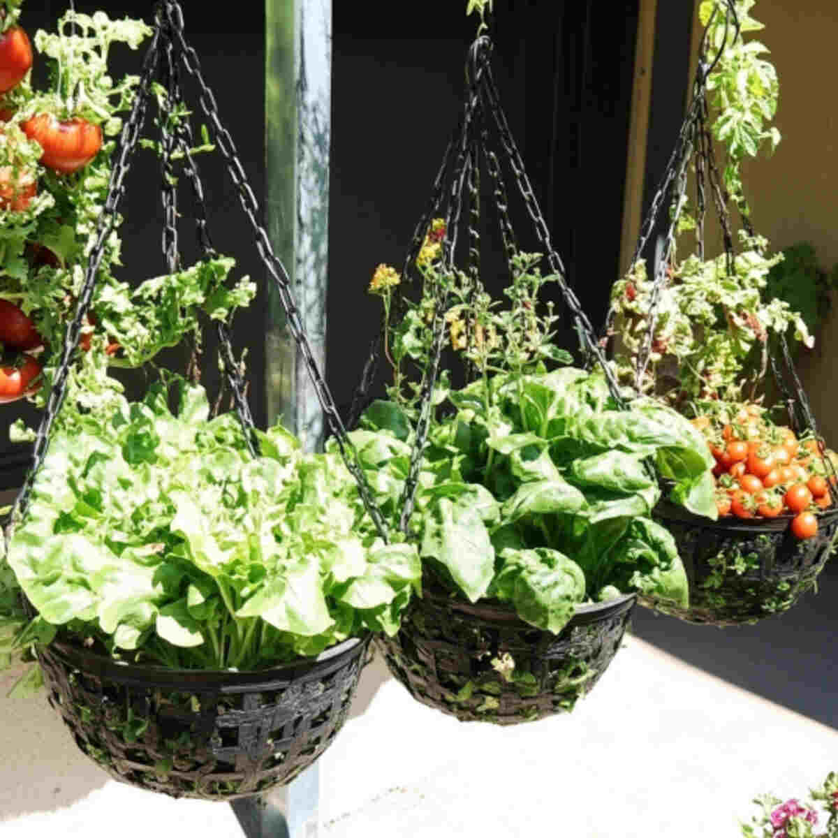 Hanging baskets free up ground space while adding visual interest, which supports the purpose of Compact Urban Vegetable Patch Garden Ideas.