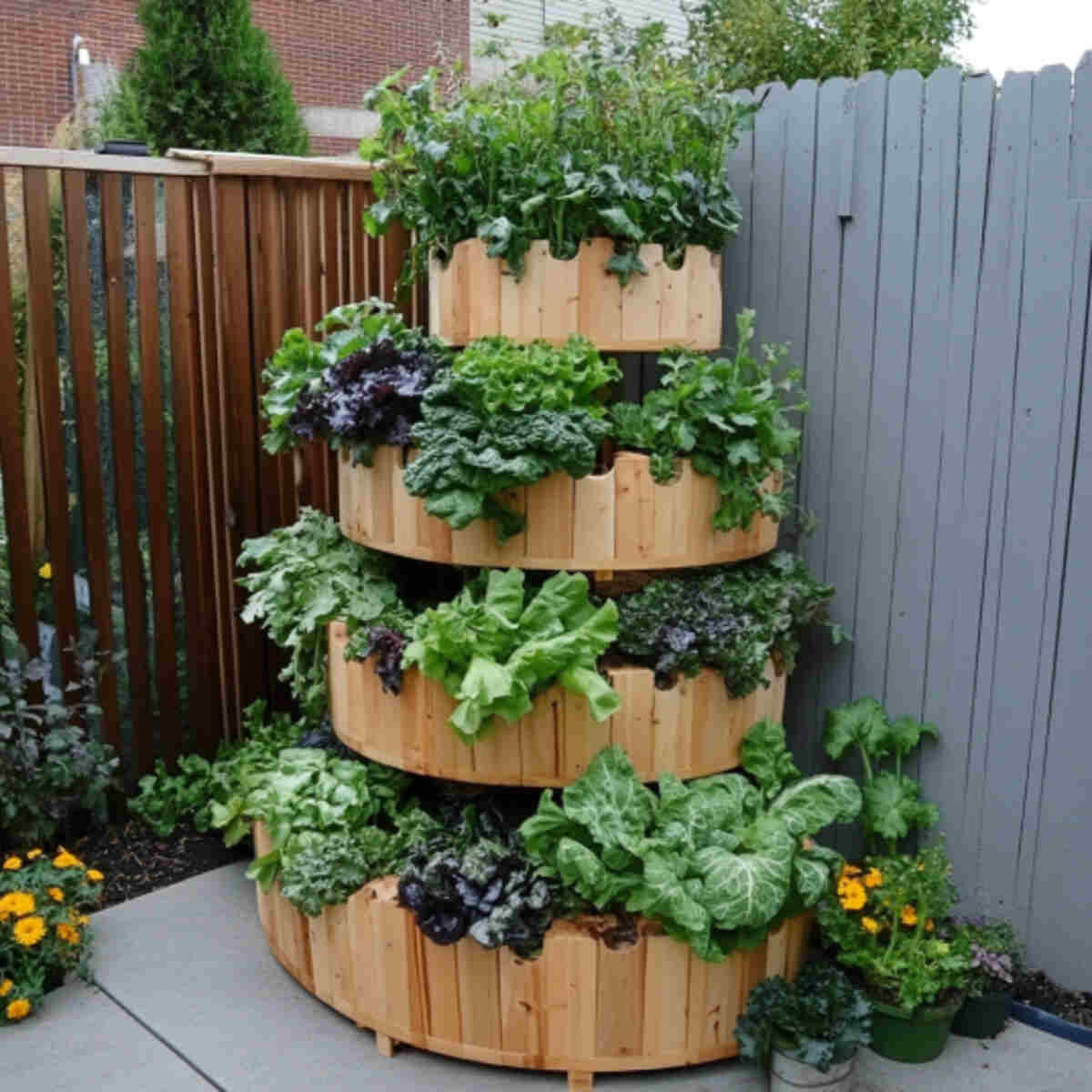 Tiered planters use multiple stacked layers to grow vegetables, which supports the goal of Compact Urban Vegetable Patch Garden Ideas by maximizing height instead of width. These stands are easy to maintain because you can reach every level without bending too much.