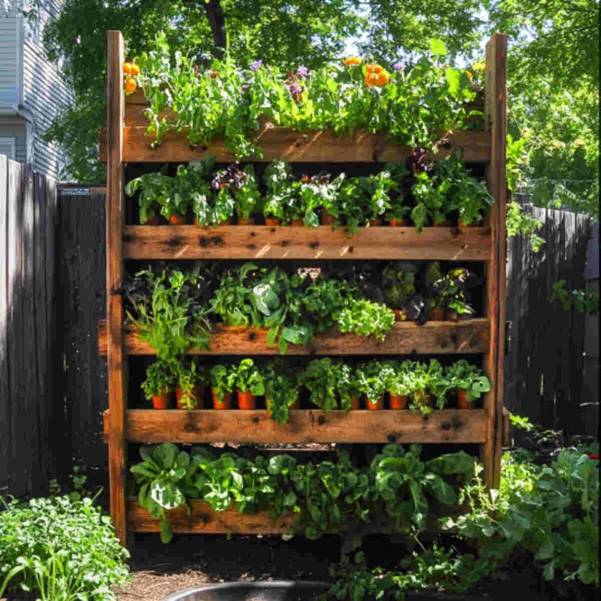 A vertical pallet garden saves floor space by growing vegetables upward, which makes it perfect for Compact Urban Vegetable Patch Garden Ideas.