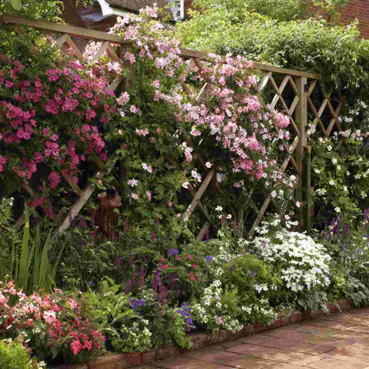 Adding vertical trellises creates height and interest in Cutting Borders Flower Garden Ideas.