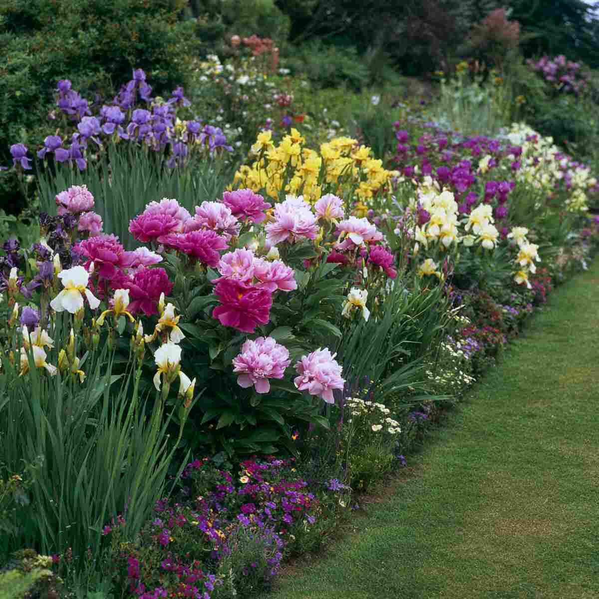 A peony and iris border delivers lush spring and early summer flowers in abundance. As Cutting Borders Flower Garden Ideas go, this pairing ensures both scent and beauty in every bouquet.