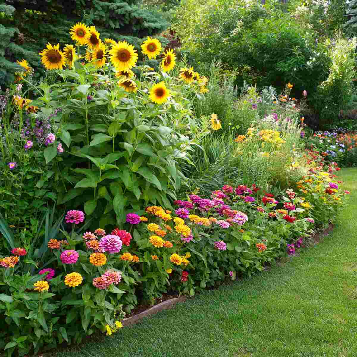 Sunflowers and zinnias are bright, cheerful, and easy to grow, making them standout options in Cutting Borders Flower Garden Ideas. Their tall and sturdy stems are ideal for cutting.