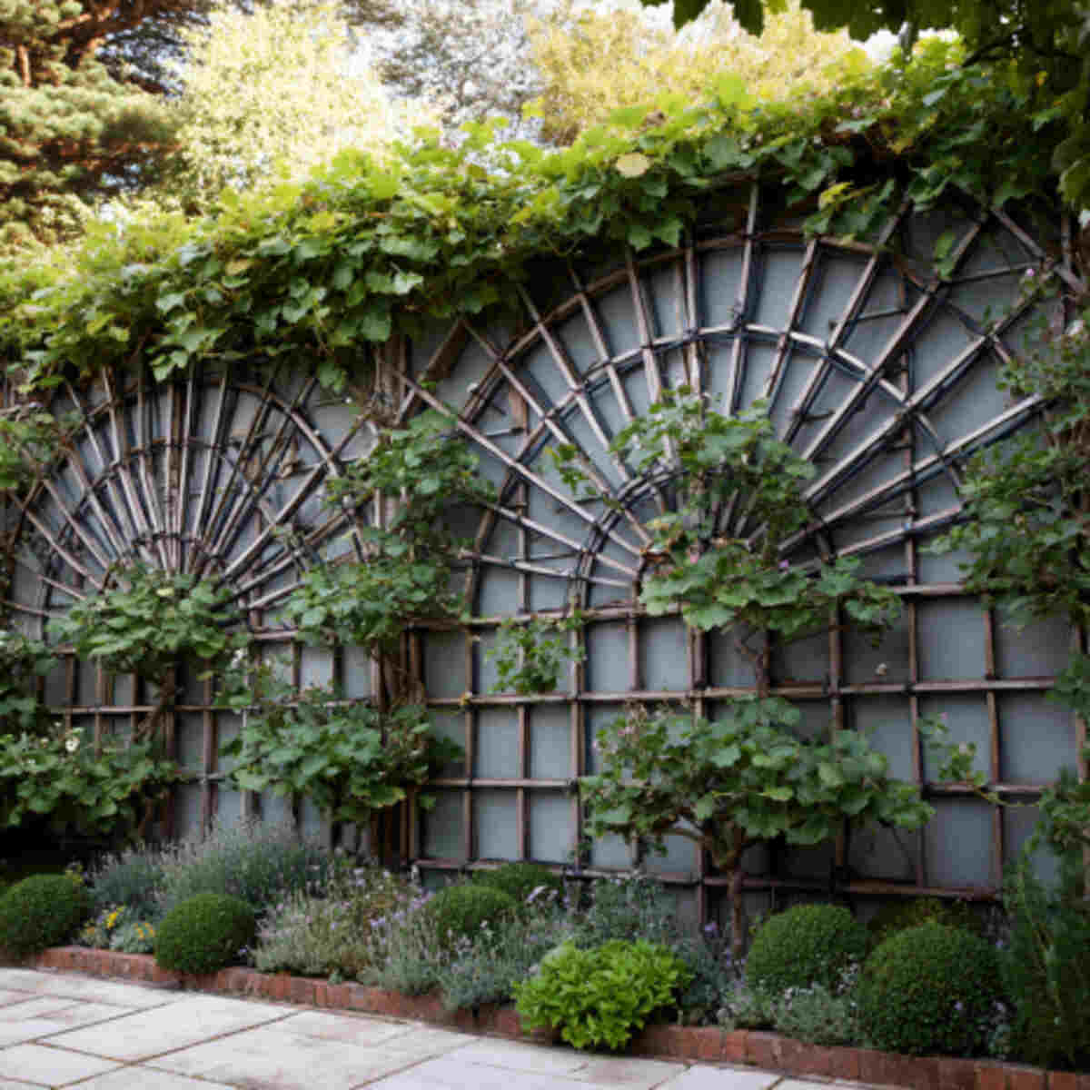 This creates an eye-catching layered look and is perfect for larger walls. It’s an advanced espalier technique fruit garden idea that combines artistry with productivity.