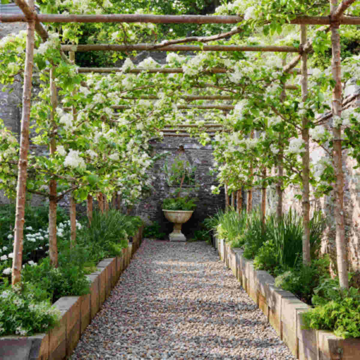 Arch espalier trains branches over a curved structure, forming living tunnels or gateways.