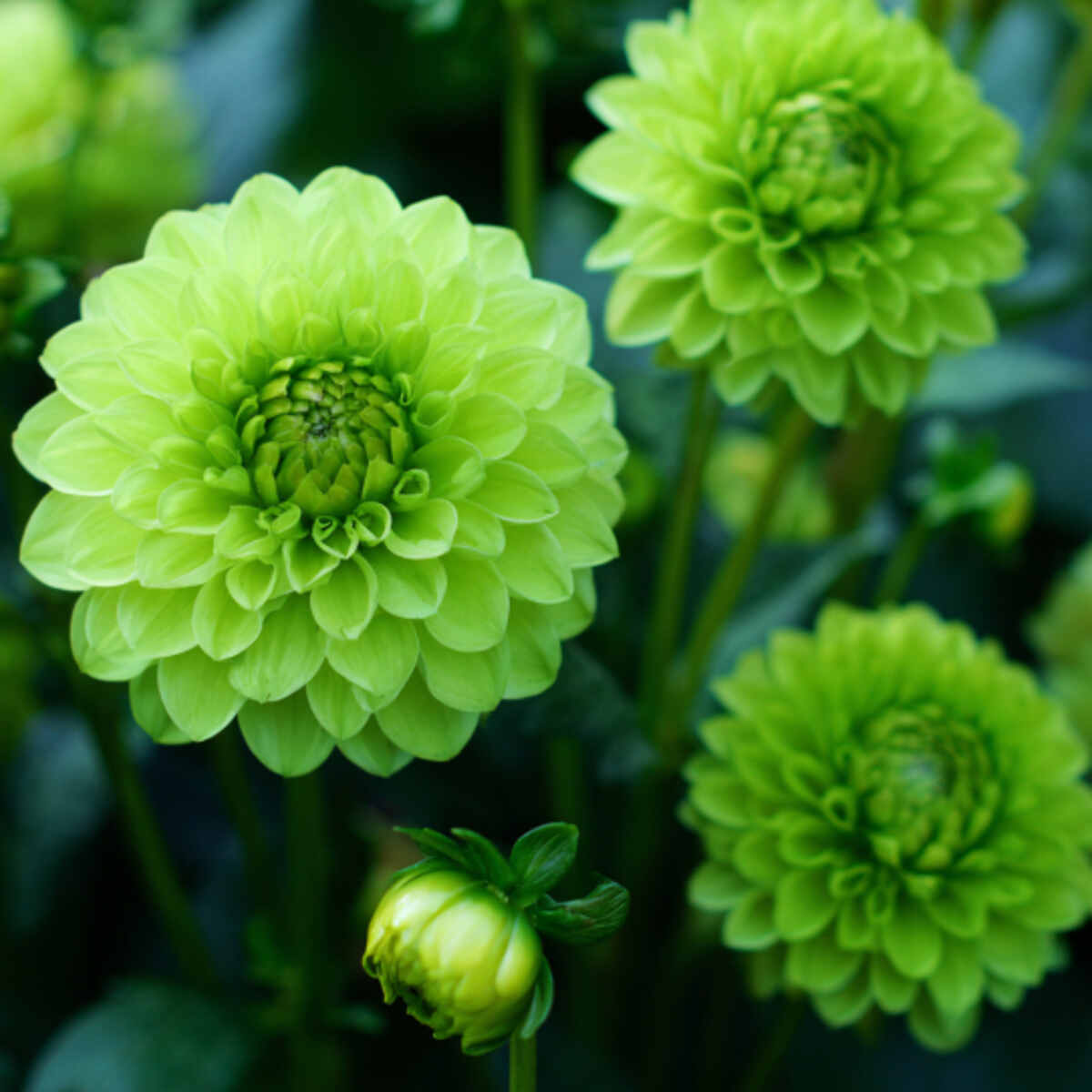Dahlias with green-tinted petals create a bold and dramatic patch. Their large blooms bring vibrancy and texture to open spaces.