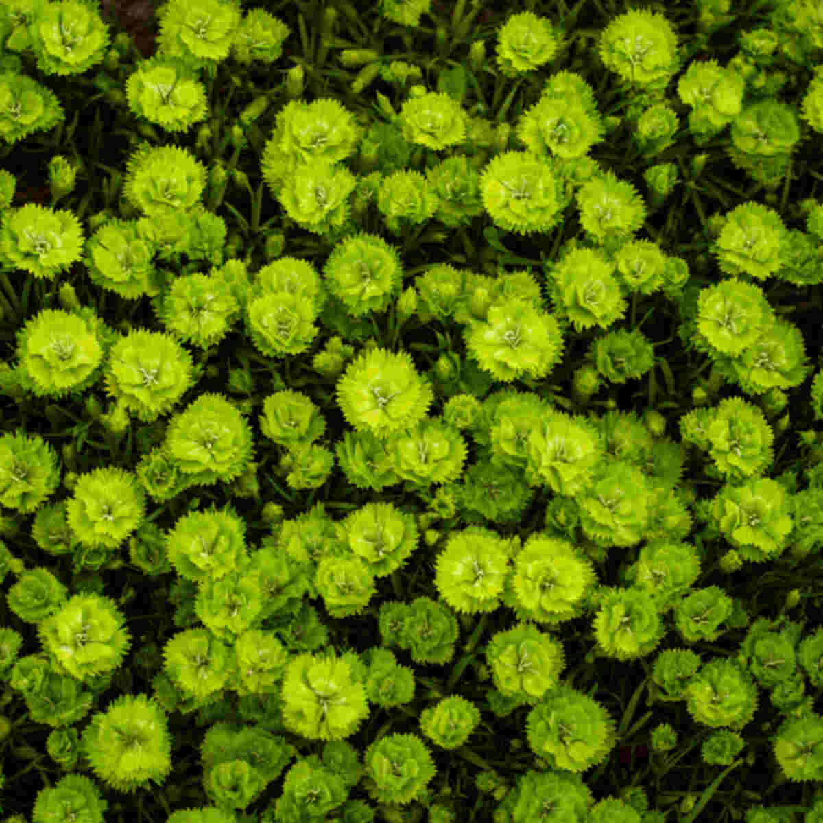 Green dianthus creates a thick carpet of green-toned flowers. It works well as ground cover to fill gaps between taller plants.