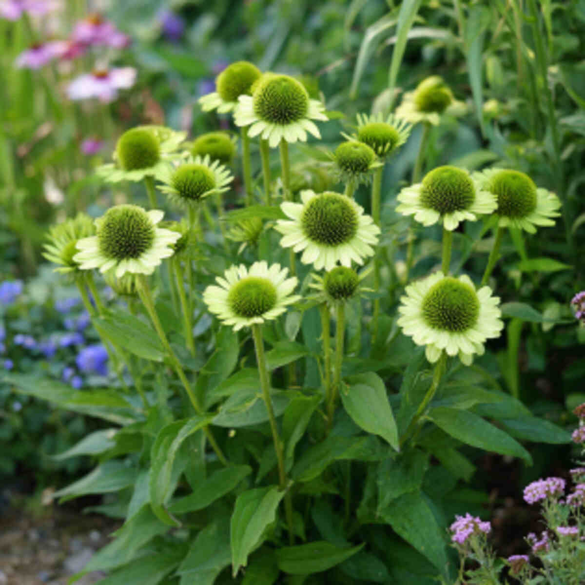 Green echinacea is unique and eye-catching when arranged in a circular bed. The symmetrical shape highlights their unusual color.