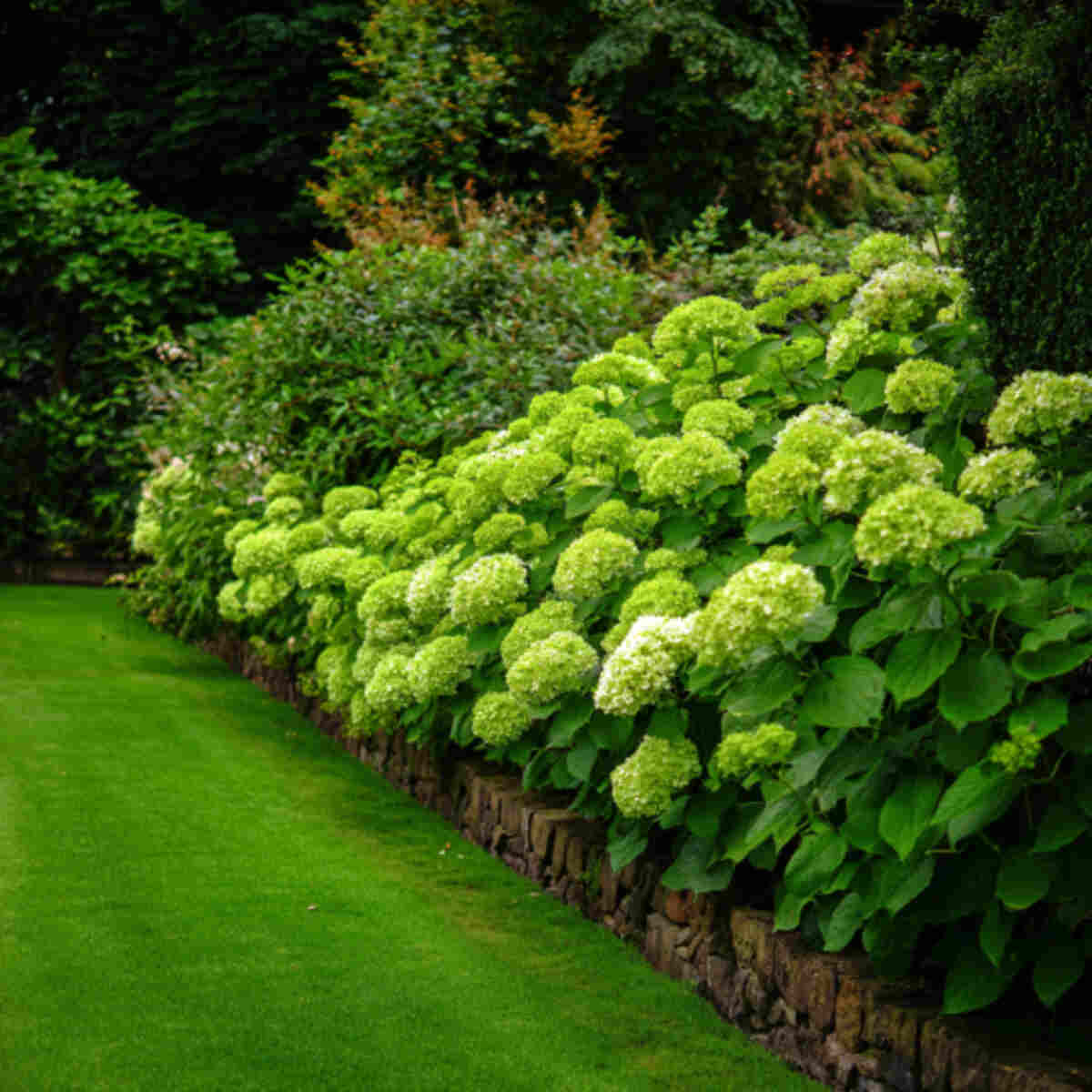 Green hydrangeas are perfect for framing pathways or fences with soft, round blooms.