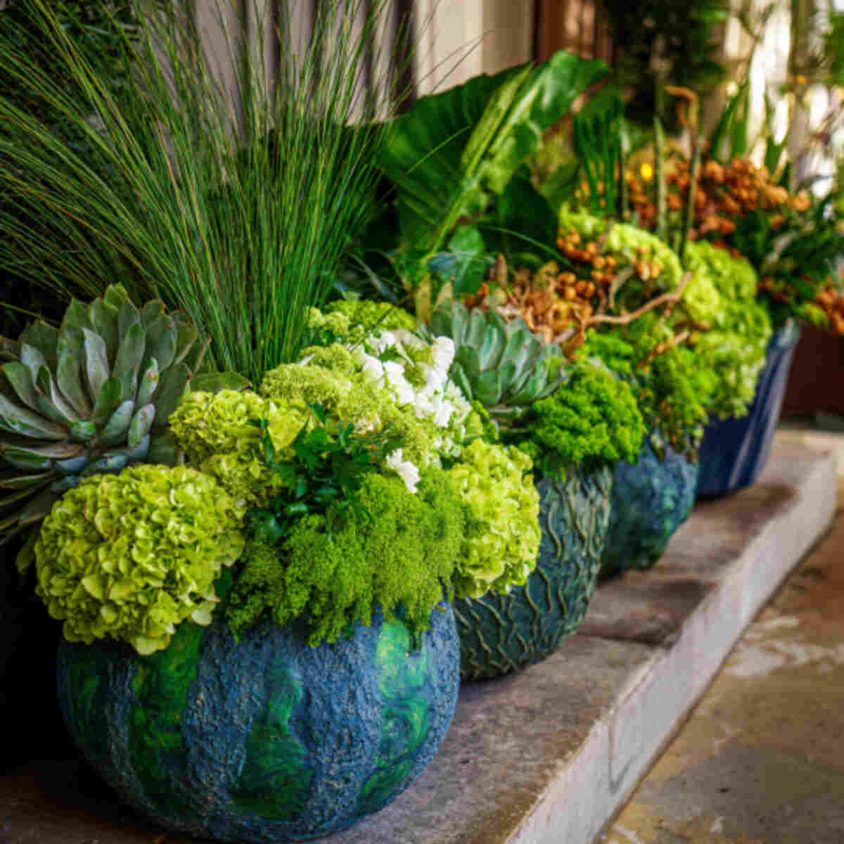 Containers filled with seasonal green blooms make versatile décor pieces. They can be moved around to refresh different areas of the garden.