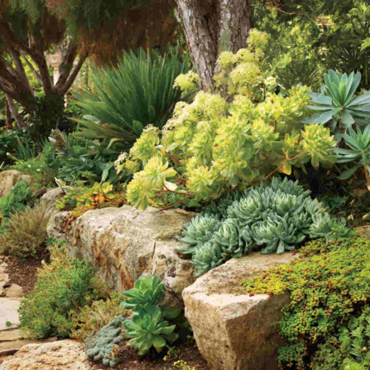 A garden inspired by succulents with greenish blooms combines low maintenance with style.
