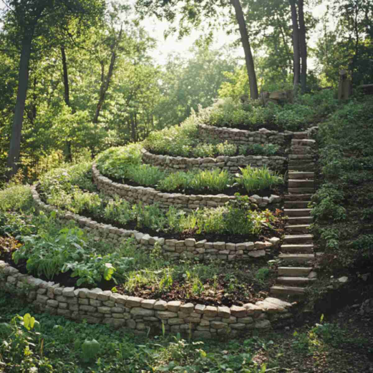 A tiered hugelkultur bed mimics natural slopes and allows multiple levels for different plants with varying sunlight needs.