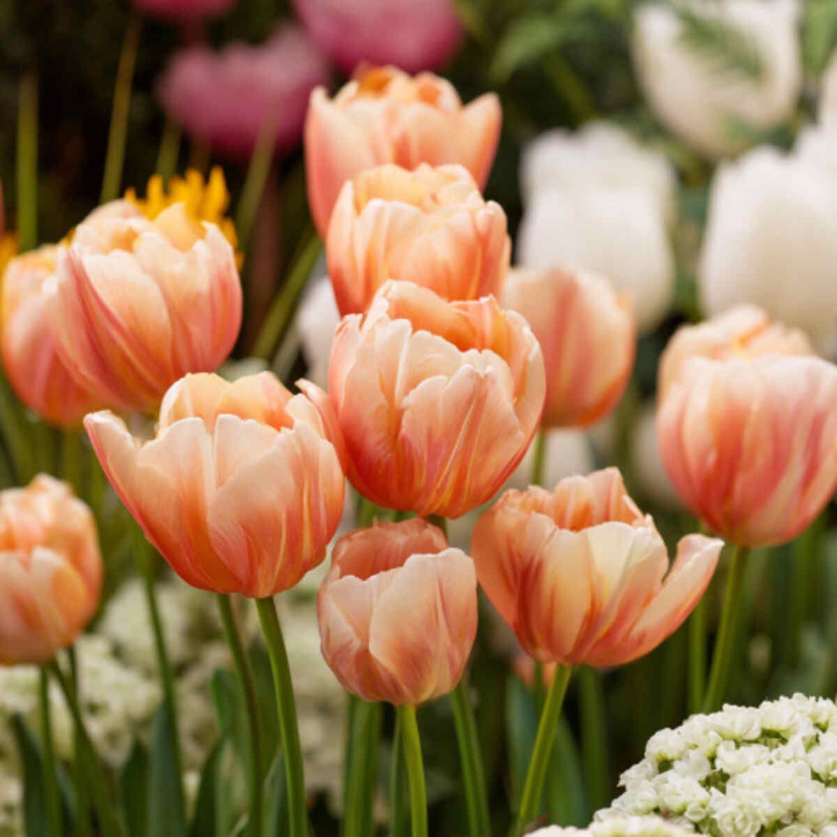 Peach and cream tulips offer a subtle yet elegant pairing that feels fresh and inviting. The soft gradient of these shades blends gently with greenery, adding warmth without overwhelming other plants.