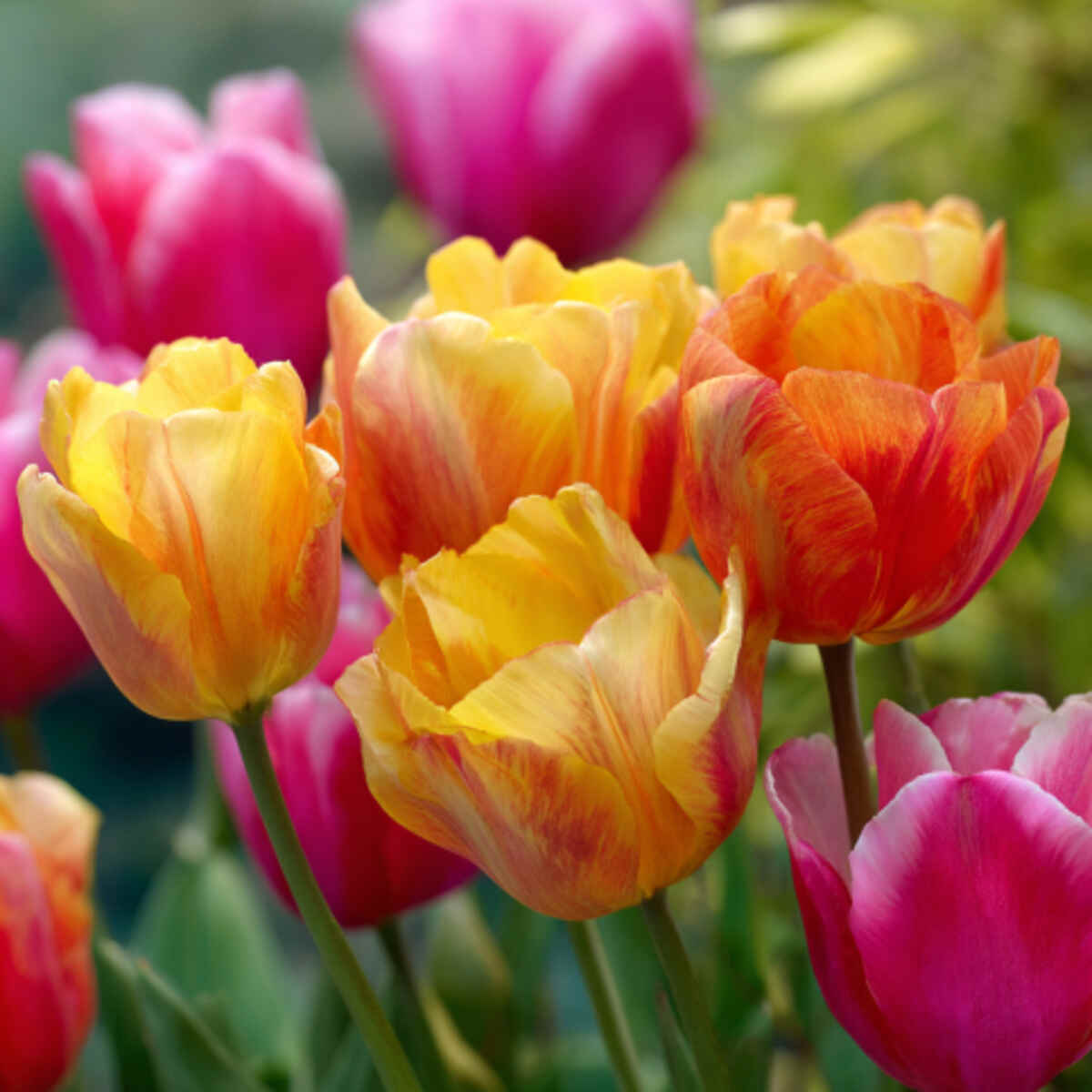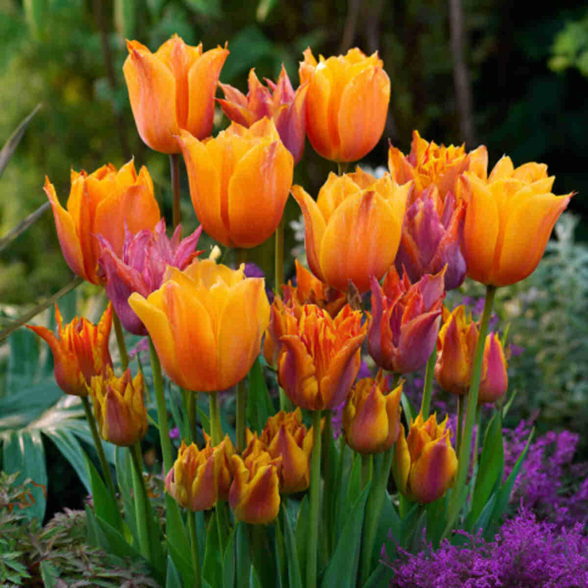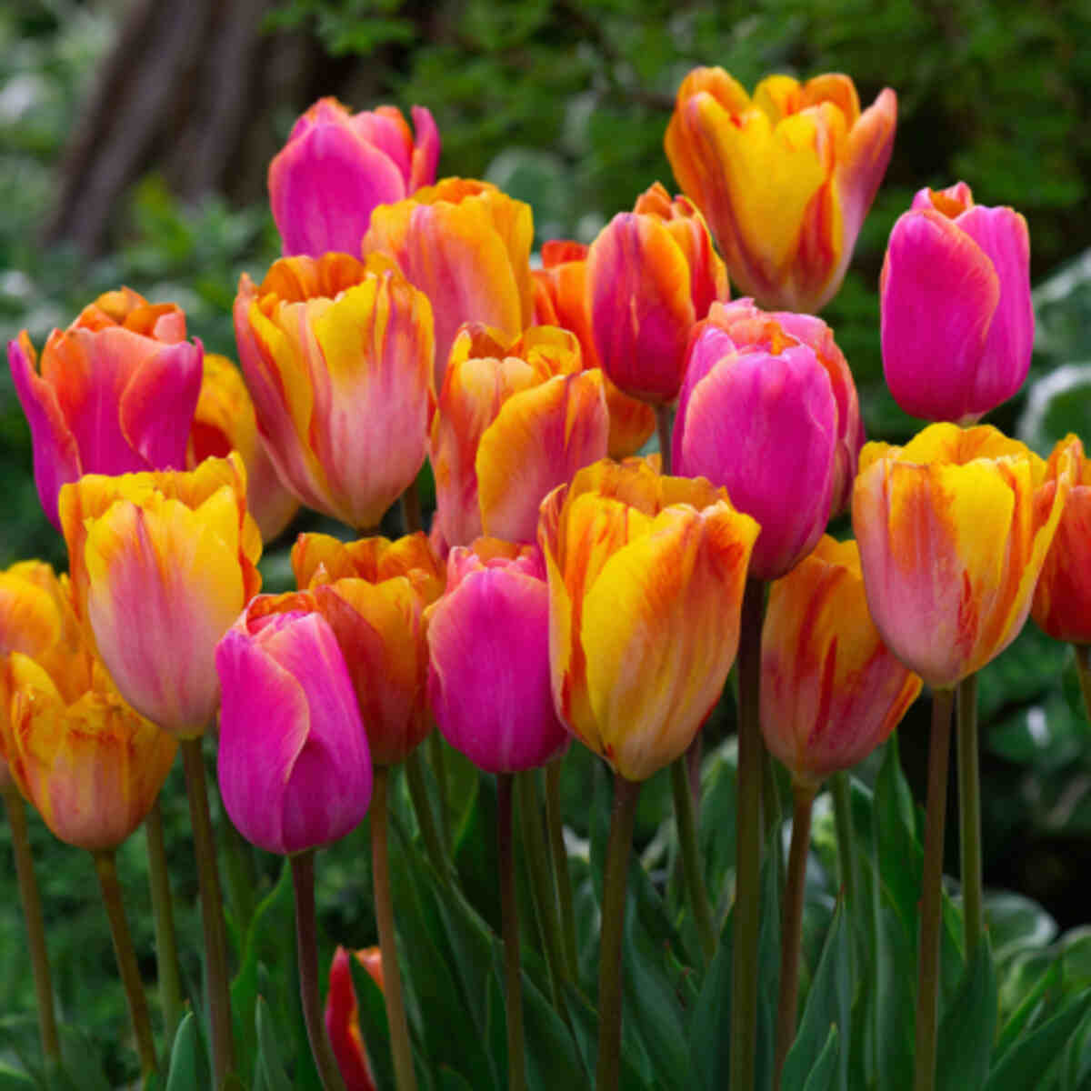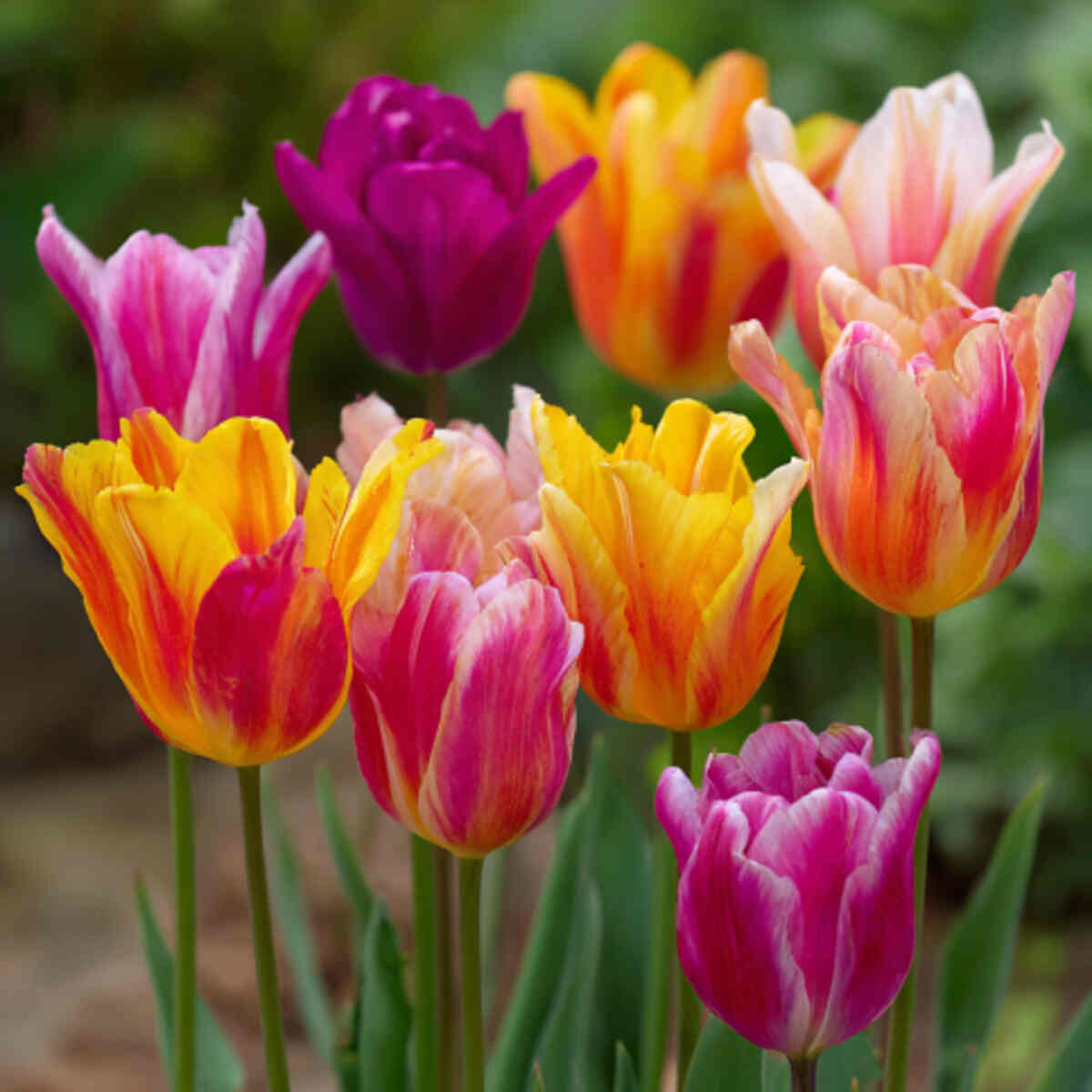 This fiery mix of tulips brings a bold and dramatic look to any garden, resembling the intensity of glowing embers.