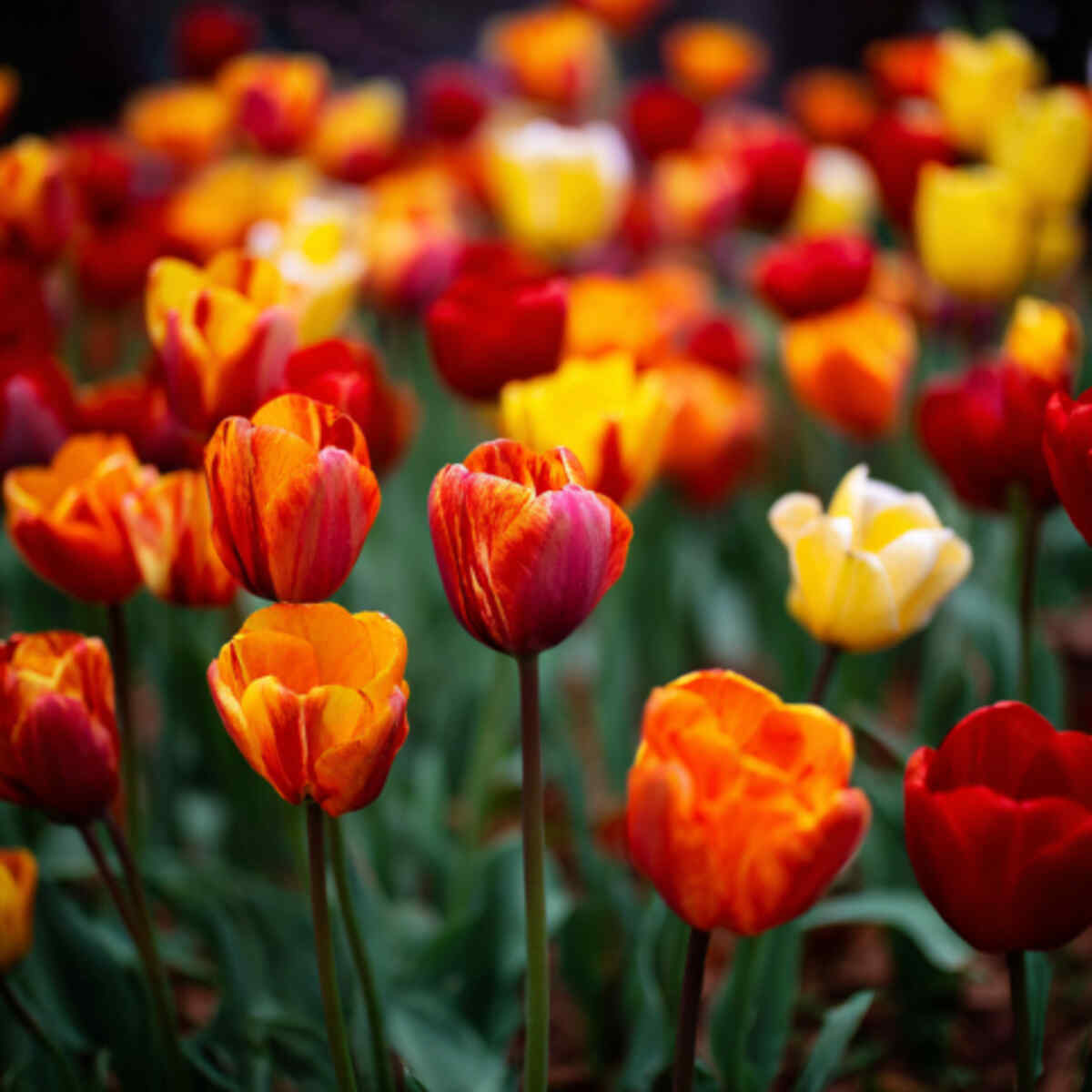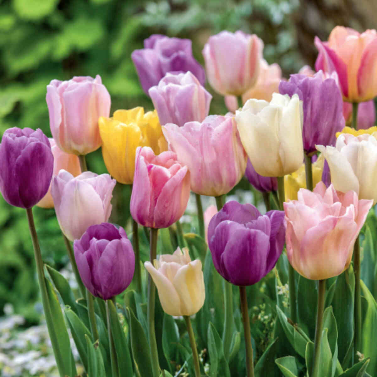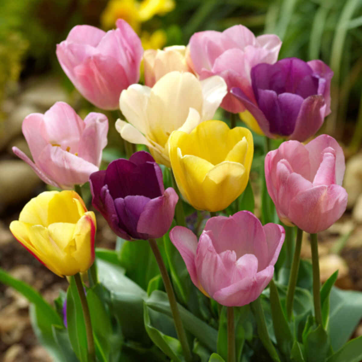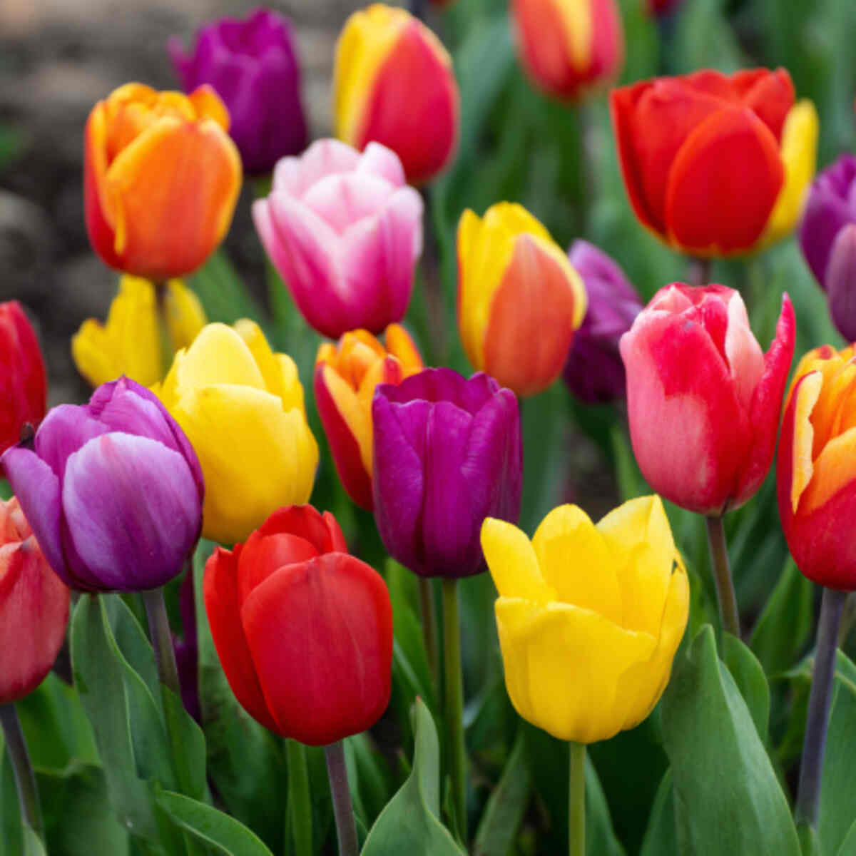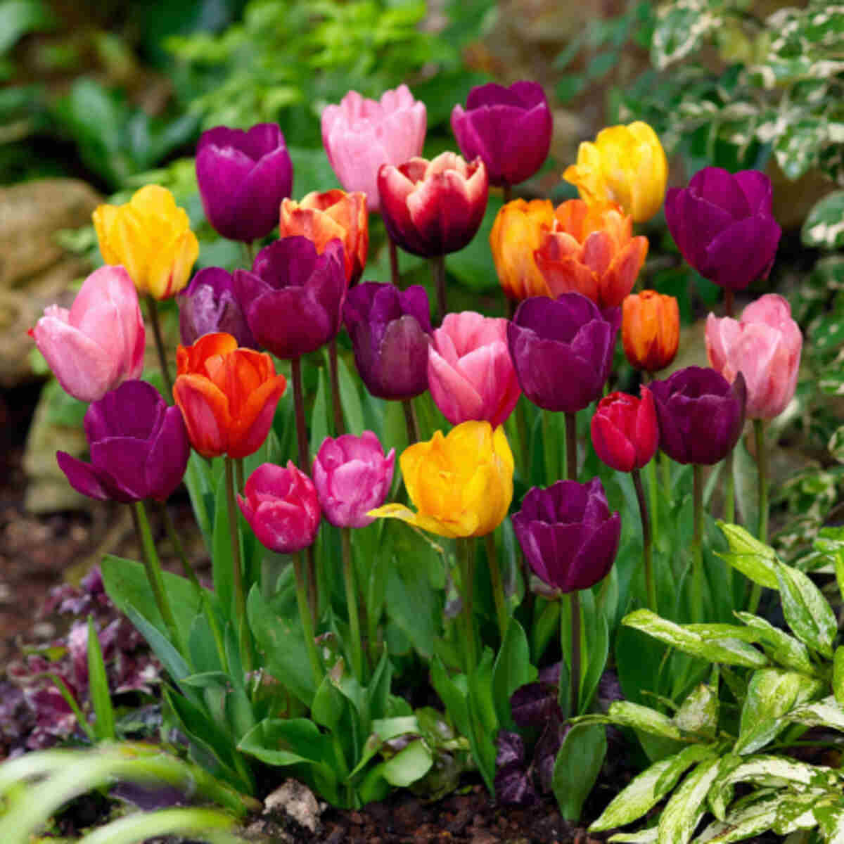 A Bold Rainbow Tulip Mix features a striking combination of red, yellow, purple, orange, and white tulips planted together for a lively and cheerful effect.