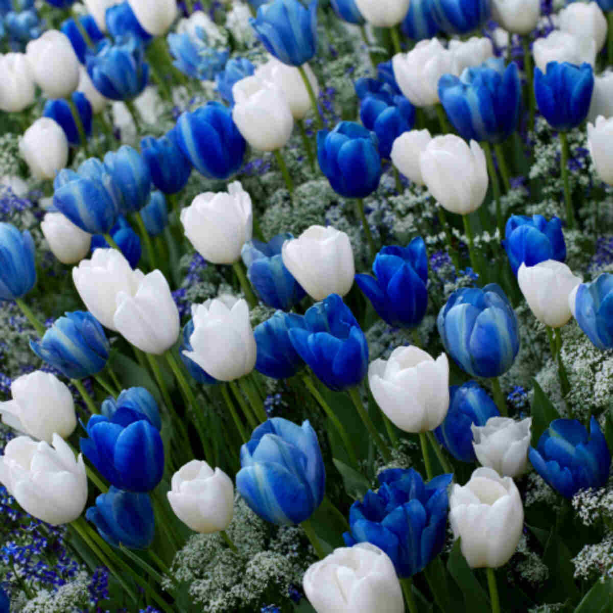 Though true blue tulips are rare, pairing white tulips with bluish or violet varieties creates a refreshing, cool-toned effect.