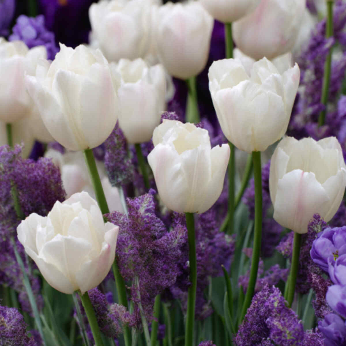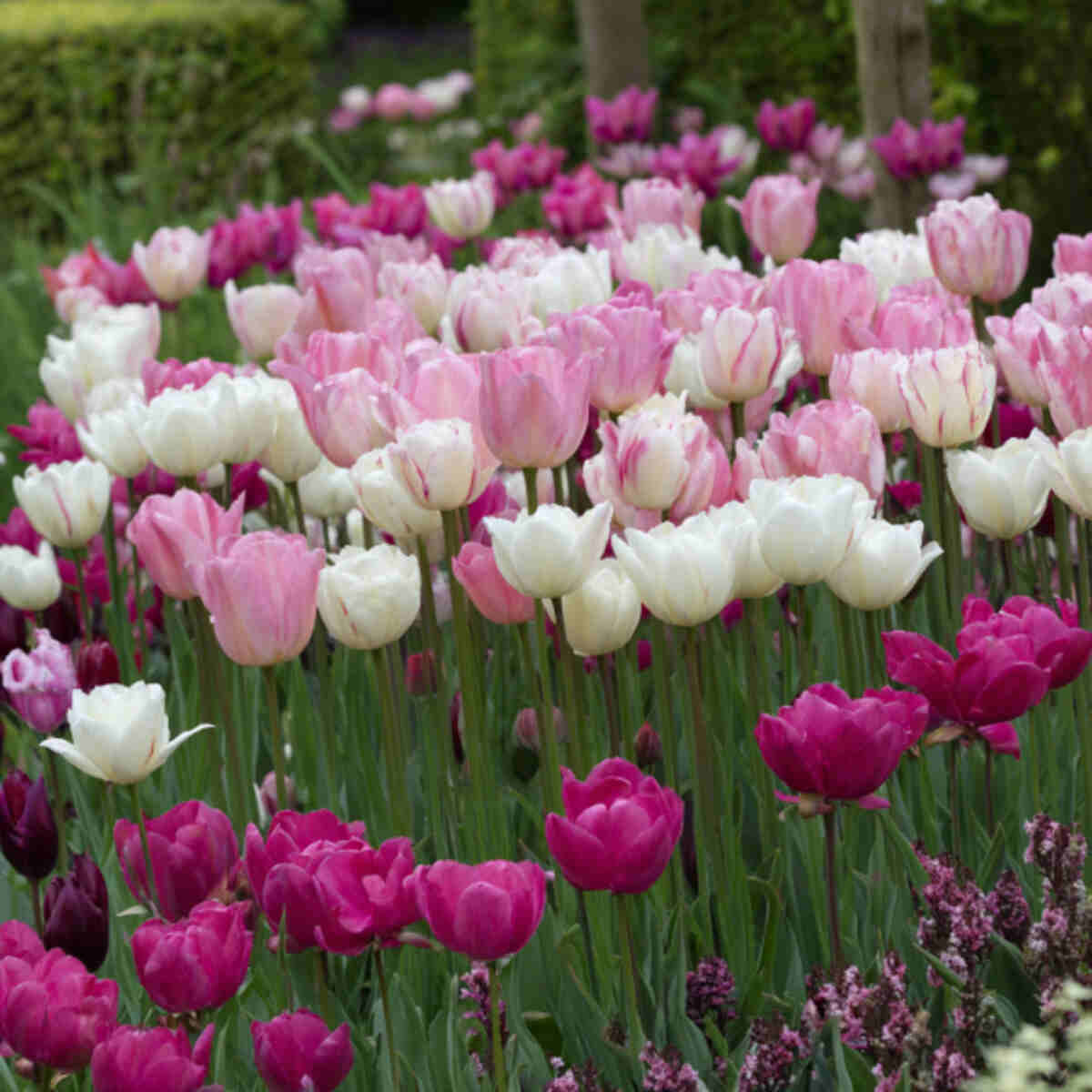 The combination of white and lavender tulips adds a refined, delicate charm to your garden space.