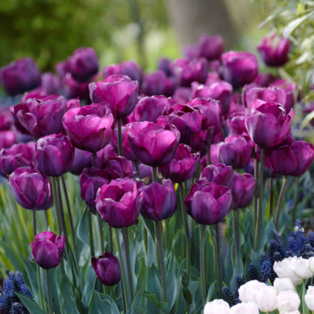 The Jewel-Tone Garden Mix features deep, rich tulip colors like ruby red, sapphire blue, amethyst purple, and emerald green foliage. These jewel shades give your garden a luxurious, dramatic appearance.