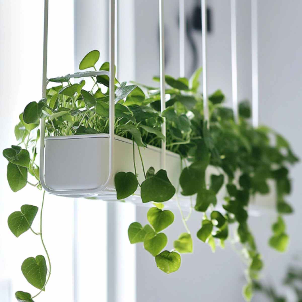 A ceiling grid with hanging planters helps you use overhead space creatively for year-round greenery.