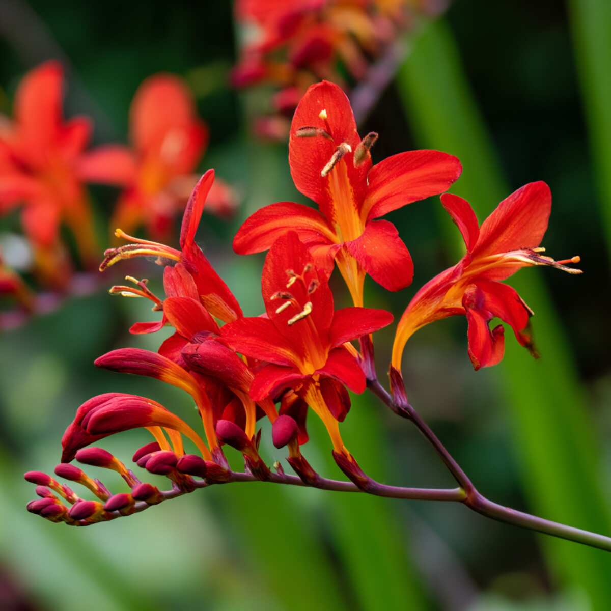 Crocosmia adds a fiery flair to Orange Flowers Garden Ideas with its arching stems covered in small, flame-like blossoms.