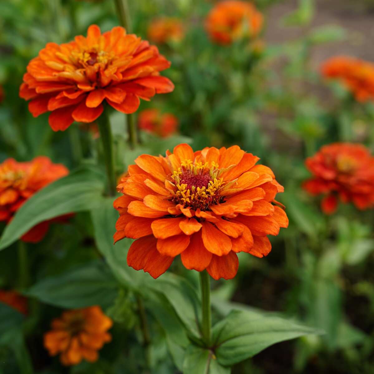 Zinnias are perfect for Orange Flowers Garden Ideas because of their long-lasting blooms and variety of orange tones.