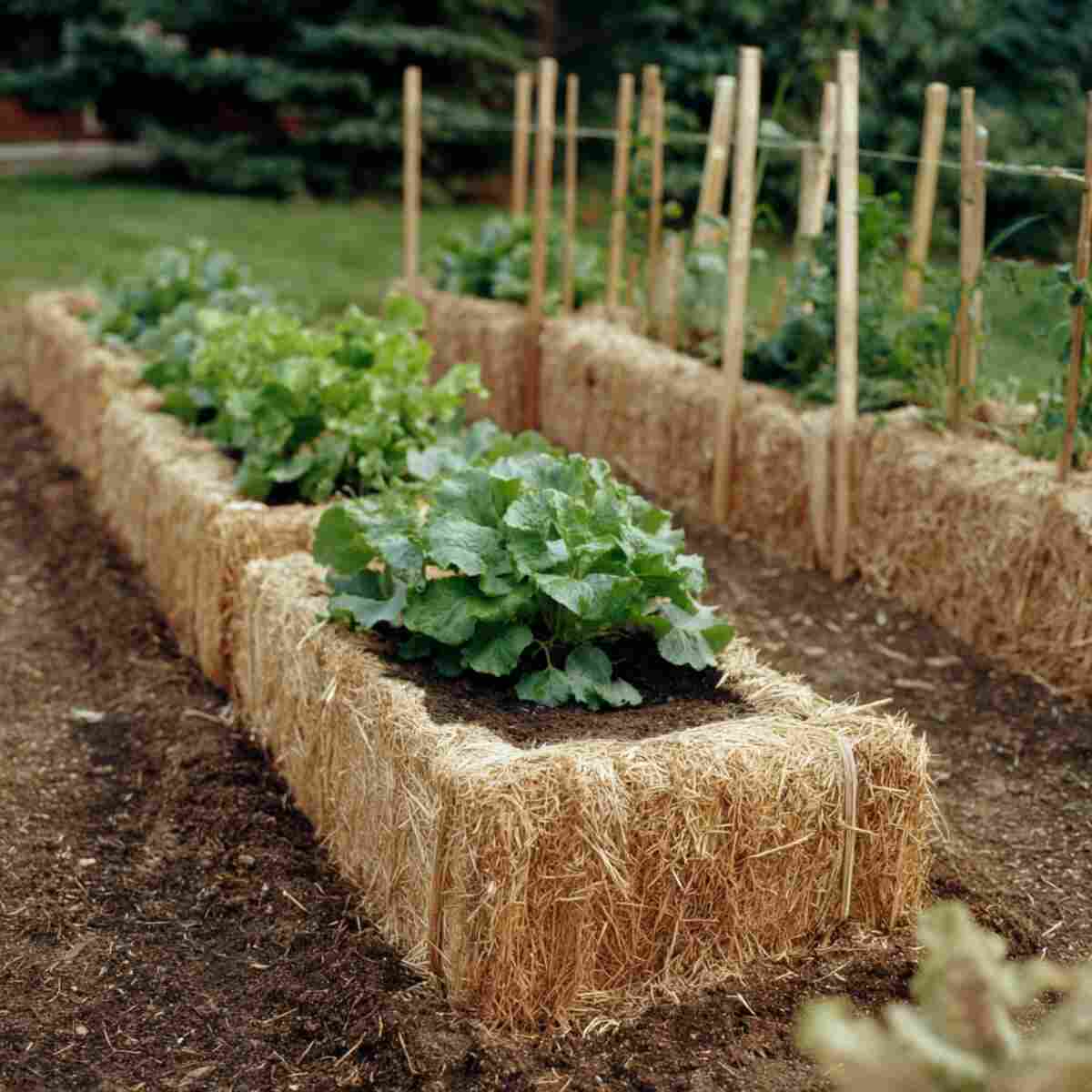 Straw bales function as temporary but effective Raised Rows Vegetable Garden Ideas, offering a biodegradable base for planting.