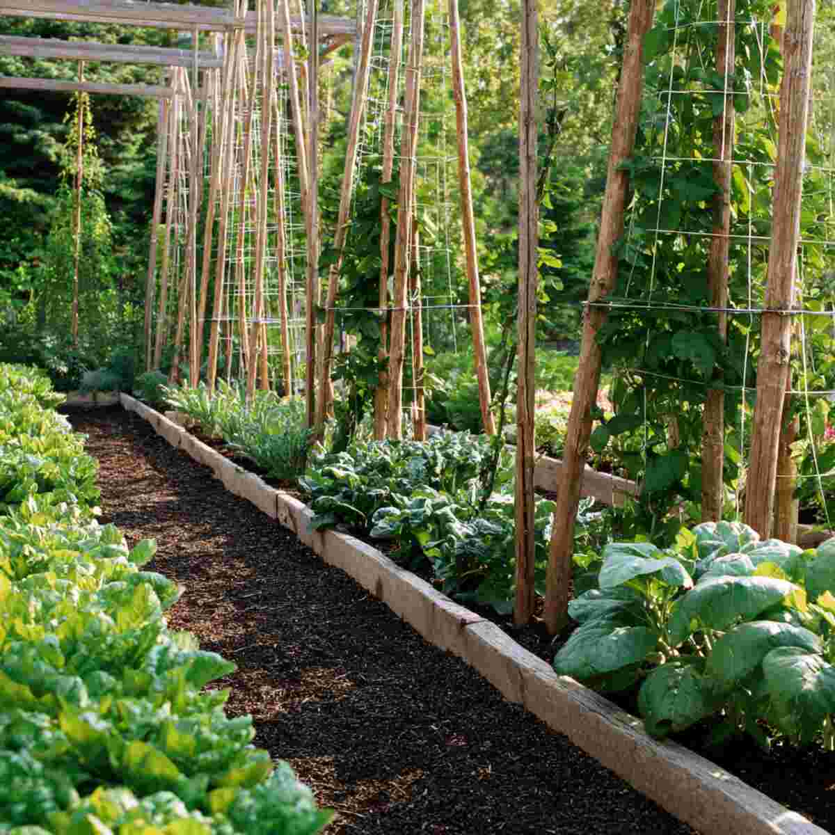 Trellises save ground space and allow better air circulation around plants like cucumbers and beans. The raised rows improve root conditions while the vertical growth maximizes yield.