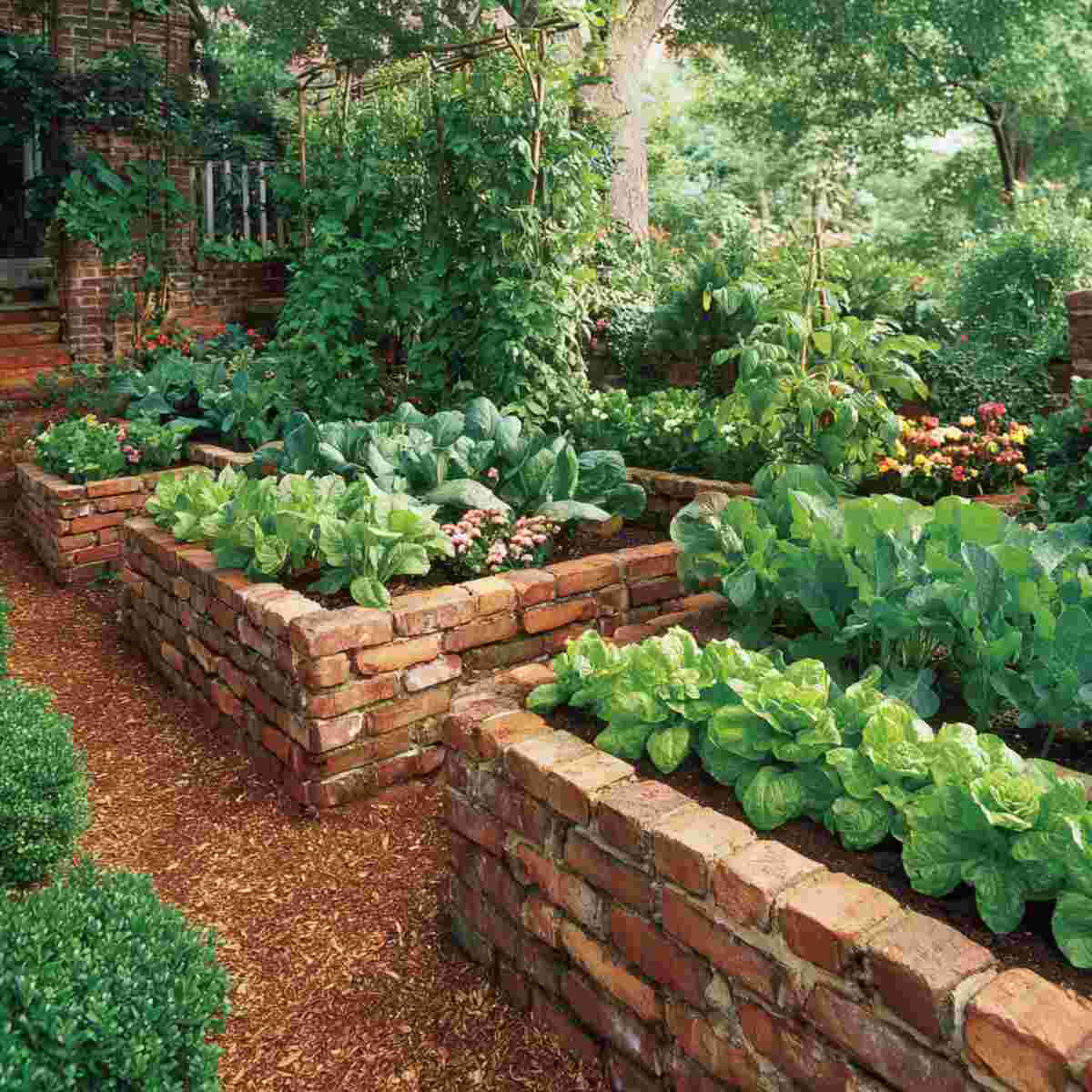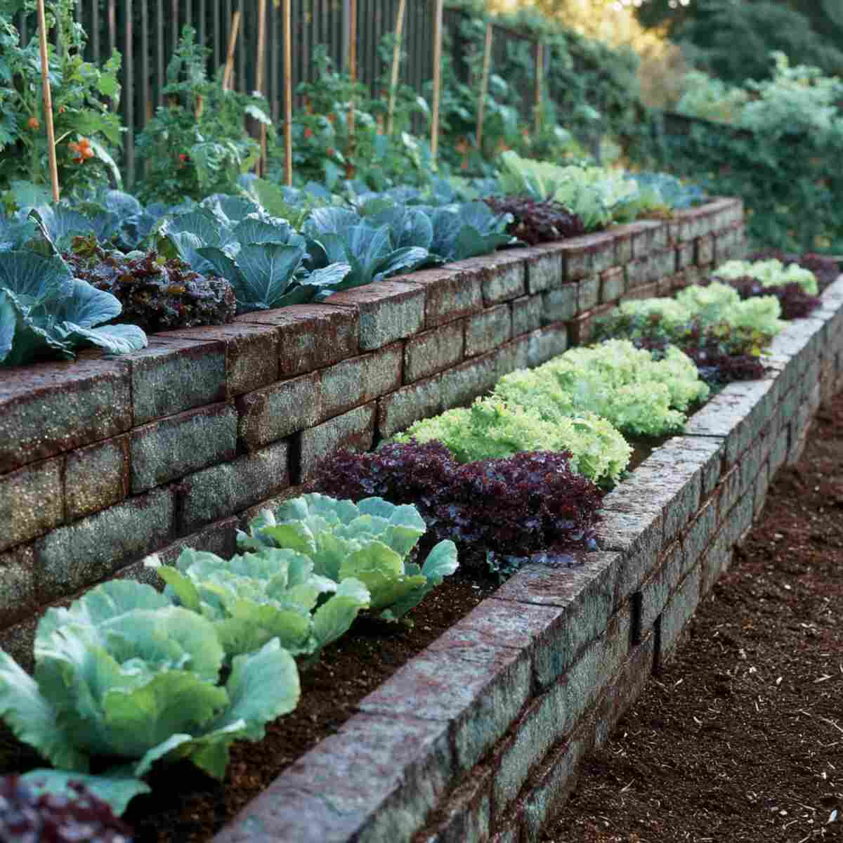 The material retains warmth, which benefits heat-loving crops like peppers and eggplants. Brick rows also help prevent soil erosion and make maintenance easier.