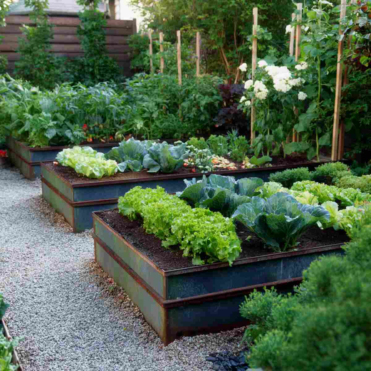 Metal-edged rows are modern and long-lasting Raised Rows Vegetable Garden Ideas that resist rot, pests, and soil movement.